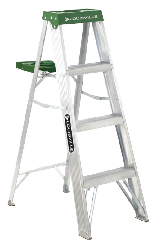 This Louisville 4 ft lightweight aluminum step ladder has a load capacity of 225 lb, rated ANSI Type II. This ladder is equipped with a molded top with handyman’s tool slots, molded pail shelf, slip-resistant rubber feet, steel gusset bracing and pinch-resistant spreader braces. This ladder is ideal for painting. The Louisville AS4004 step ladder meets or exceeds the safety standards set by ANSI, CSA and OSHA.