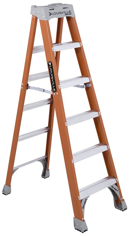 This Louisville 6 ft non-conductive fiberglass step ladder has a load capacity of 300 lb, rated ANSI Type IA. This ladder is equipped with the new and innovative raptor top with magnet and multiple tool slots, SHOX impact absorption system, new raptor boots with non-marring bonded tread mechanically fastened to the upper boot to create a secure slip-resistant footing, inside spreader braces, wide back braces and double-rivet step construction. The Louisville FS1506 step ladder meets or exceeds the safety standards set by ANSI, CSA and OSHA.