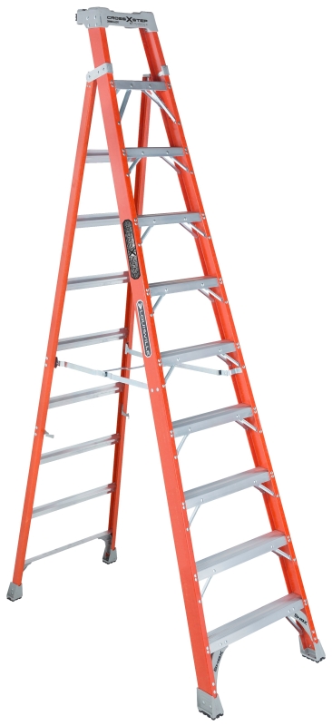 This Louisville 10 ft fiberglass cross step ladder has a type IA duty rating with load capacity of 300 lb. This ladder combines the shelf and step ladder for a 2-in-1 combination made to take on multiple placement locations. The shelf design and its unique ProTopâ„¢ and innovative locking mechanism allows for positioning against a wall, building or pole. When unlocked, this ladder sets up as a regular step ladder. The angles of the step ladder allow the capability to get closer to the work area. The cross-step ladder is equipped with a V-shape ProTopâ„¢ with non-marring slip-resistant rubber tread that allows it to be placed safely on corners and poles. This ladder’s ProTopâ„¢ also features a magnet and multiple slots that allow quick and easy access to your tools.