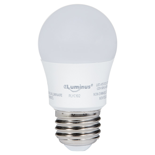 This Luminus 5.5-watt LED A15 light bulb is a great lighting solution for your living space. This long-lasting LED bulb has a lifespan of 15,000 hours and emits a warm white glow (2700K). This LED bulb produces the same light output as a traditional 40-watt bulb. This product is backed by a 3-year limited warranty.