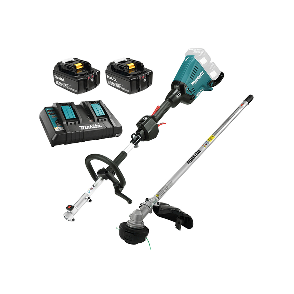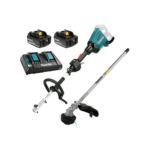 The Makita DUX60PTM5X is a powerful split shaft line trimmer compatible with various attachments. It features a brushless motor, 3-speed options, a variable speed trigger, and reverse mode for clearing debris. Safety features include an electric brake and soft start function. The kit includes two 5.0Ah batteries, a dual port charger, a straight shaft trimmer attachment, and essential tools for efficient trimming.
