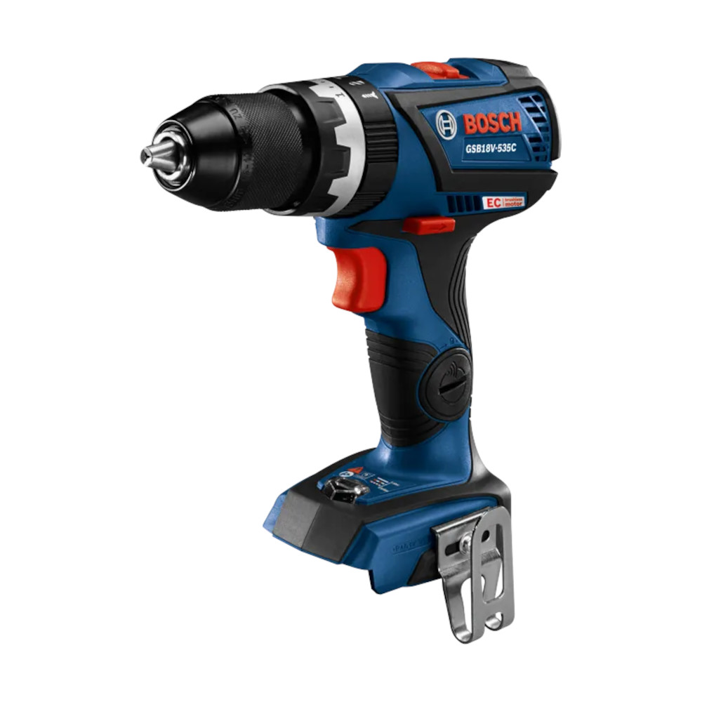 This Bosch Hammer Drill/Driver combines next-gen user control with a compact, powerful cordless tool. The GSB18V-535CN 18 V EC Brushless Connected-Ready 1/2 In. hammer drill features Bluetooth® connectivity, Bluetooth® connectivity (which connects with an optional Connectivity Tool Module), linking the free Bosch Toolbox app on a mobile phone for enhanced tool control and detailed feedback. It has a powerful EC Brushless motor, that provides ample power for 535 In.-Lbs. of torque and 0-28,500 beats per minute (BPM). It features a compact design for professional results in a compact package. It has variable speed settings; one for high-speed (0-1,900 RPM) and one for high power (0-600 RPM). The cordless drill has KickBack Control, which reduces the risk from sudden rotational torque reaction in a bind-up scenario for reduced the risk of user injury. The 20+1 precision clutch reduces fastener damage and prolongs tool life. It has an all-metal chuck that provides durability, and it has a longer belt clip for a more secure hold. This is a bare-tool kit; the battery and charger are sold separately.
