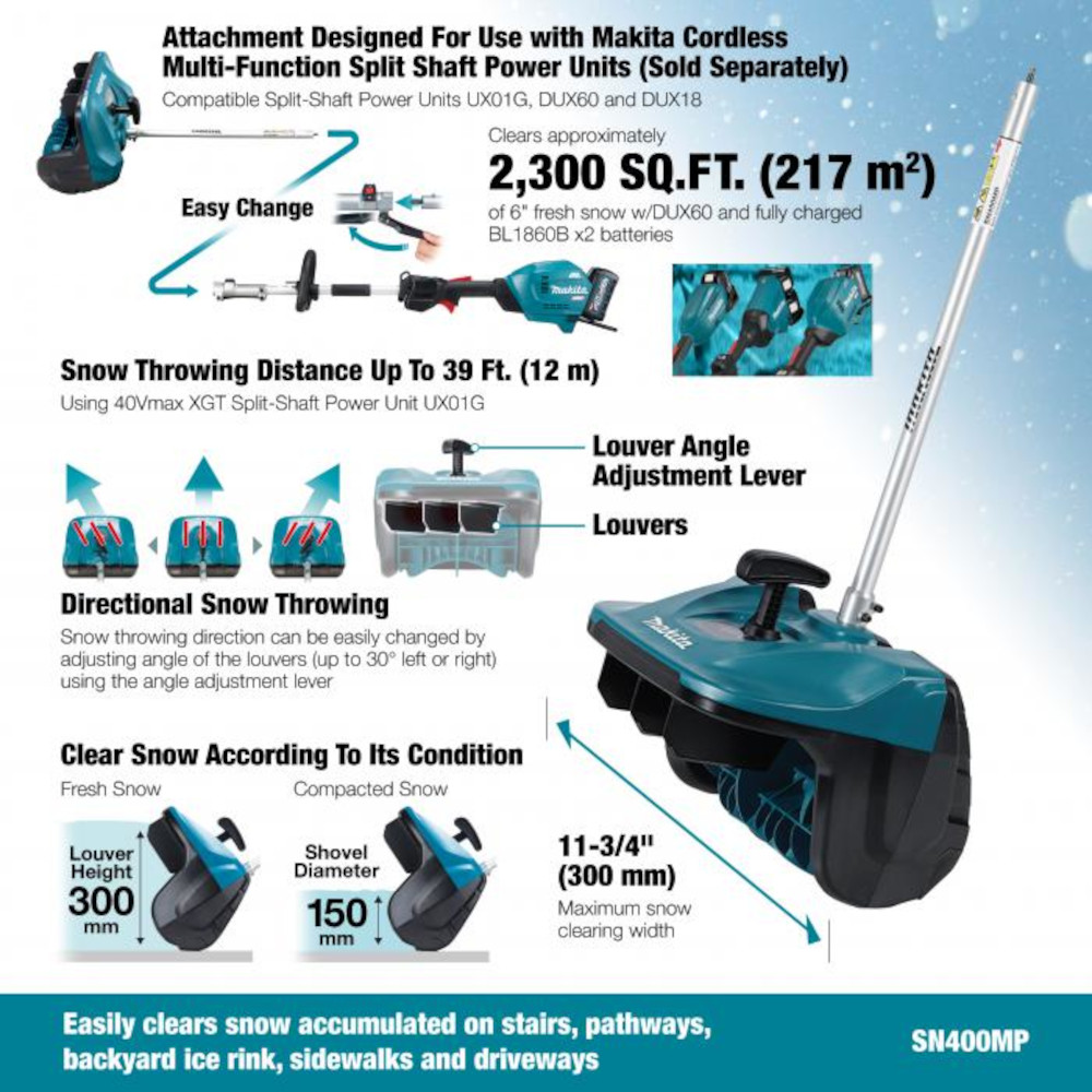 When used with the 40Vmax XGT® UX01G power head, it delivers strong performance with a maximum throwing distance up to 39 ft (12 m) and a snow clearing height up to 11-3/4″ (300 mm). For better control, you can quickly adjust the snow throwing direction by changing the louver angle up to 30° left or right using the angle adjustment lever. A lightweight design helps reduce fatigue during extended snow clearing.