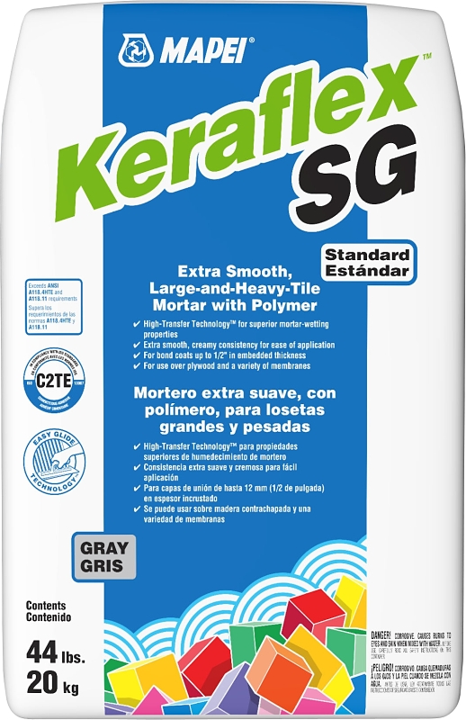 Keraflex SG is a standard-grade, versatile, large and heavy-tile mortar and thin set mortar for tile and stone installations on floors, walls and countertops. It is formulated as non-sag for walls and non-slump for floors. Keraflex SG is a polymer modified mortar formulated with Easy Glide Technologyâ„¢ for ease of application and offers good adhesion to substrates and tile. It can also be used as a mortar over uncoupling, crack isolation, sound reduction and waterproofing membranes.