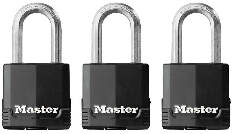 The Master Lock Magnum® M115XTRILF laminated padlocks feature a 1-7/8 in (48 mm) wide laminated steel body for maximum strength and reliability and is surrounded by stainless steel and zinc outer components for weather resistance. The Rust-Oleum® certified protection provides a lifetime guarantee against rusting on the lock body and covered lock body, keyway and shackle seals offer additional weather protection. The 5/16 in (8 mm) Dia octagonal shackle is 1-1/2 in (38 mm) long and made of Tough-Cut™ boron-carbide, 50% harder than hardened steel, offering maximum resistance to cutting and sawing. The four pin cylinder prevents picking and the dual locking ball bearings provide maximum resistance against prying and hammering. The lifetime guarantee provides peace of mind from a brand you can trust.