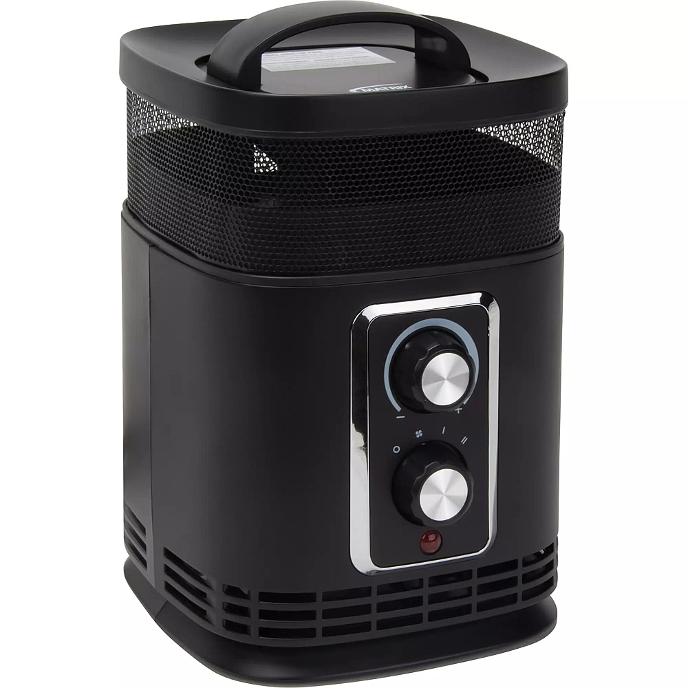 • Features 360 degree outlet air, PTC heating elements, adjustable thermostat, tip-over switch, overheat protection, and carry handle