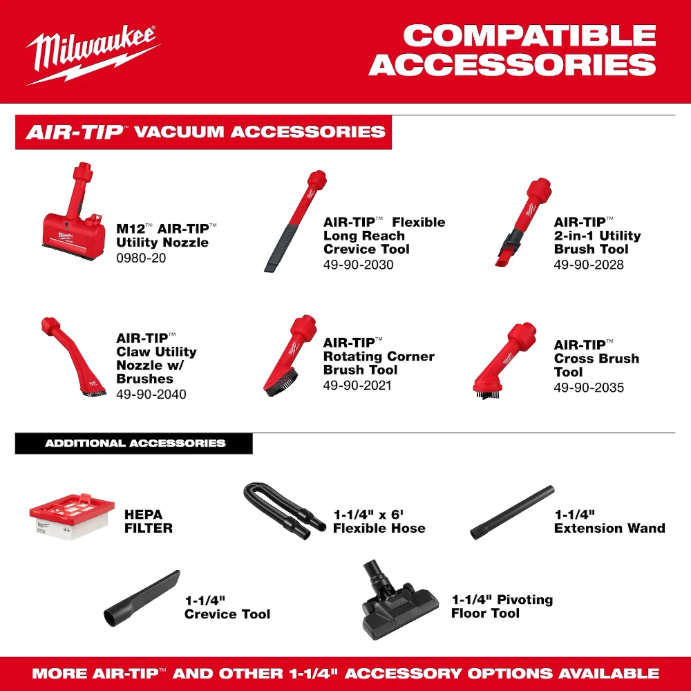 Our M18™ Brushless Handheld Vacuum is a quick and effective cleanup solution for a variety of jobsite conditions. With its ergonomic form factor and comfortable handle design, this product is optimized for quick cleaning tasks. The integrated debris separator provides the highest sustained airflow during the cleanup of sawdust, drywall dust, wood shavings, metal shavings, and other common jobsite debris. This technology significantly reduces the downtime spent cleaning filters and performing vacuum maintenance. Equipped with a high-performing brushless motor, the vacuum delivers 40CFM and 63 inches of suction. When paired with an M18™ REDLITHIUM ™ XC5.0 Battery pack, this handheld vacuum delivers over 20 minutes of runtime. For increased visibility in dimly lit jobsite environments, the vacuum has an LED ring located around the nozzle, providing shadowless lighting. For quick disposal of debris, the M18™ Brushless Handheld Vacuum has an easy-to-remove tank design, composed of dedicated tank grip points and a quick-release latch. The included HEPA filter ensures the collection of fine dust and debris. The vacuum is kitted with five 1-¼” diameter accessories to provide ultimate versatility- (1) 4ft flexible hose, (2) extension wands, (1) crevice tool, and (1) pivoting floor tool.