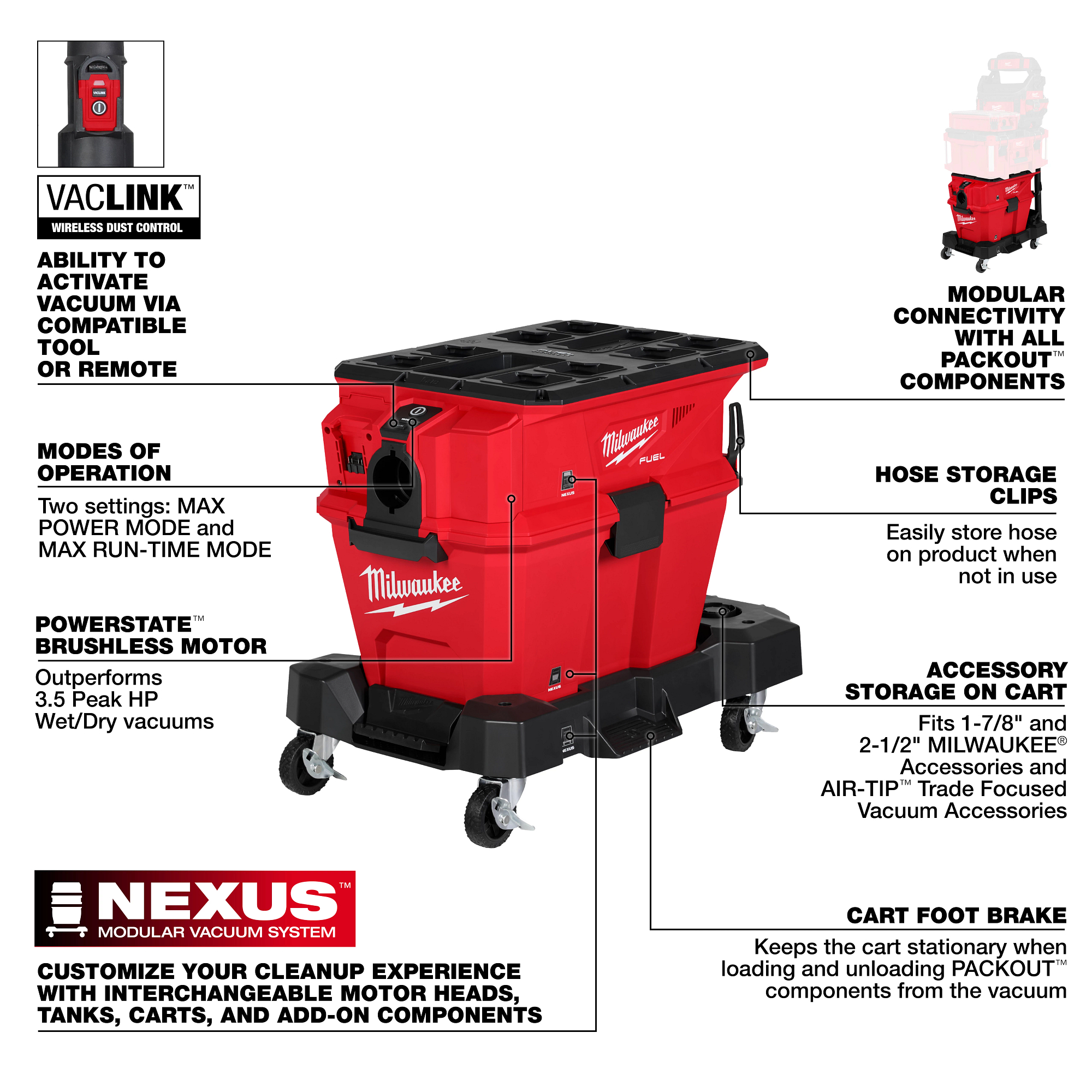 The MILWAUKEE® M18 FUEL™ NEXUS™ 6 Gallon Wet/Dry Vacuum w/ PACKOUT™ Compatibility & VACLINK™ DELIVERS CORDED PERFORMANCE with OVER 40 MIN OF CONTINUOUS CLEANING, allowing users to CLEAN ANYWHERE, WITH NO CORD LIMITATIONS. The POWERSTATE™ Brushless Motor and REDLINK PLUS™ Intelligence deliver 95 CFM and the power to clean up more common jobsite debris than 3.5 Peak HP wet/dry vacuums. On an M18 REDLITHIUM™ FORGE™ HD12.0 battery pack, this vacuum can clean up to 1,800 sqft. on a single charge or up to 44 minutes of continuous cleaning on max run-time mode. This cordless vacuum eliminates corded hazards like slips, trips, and falls and eliminates the need to search for power on the job site. This vacuum is quieter than leading corded competitors and ideal for any environment. This vacuum is part of the NEXUS™ Modular Vacuum System. It allows users to customize their cleanup experience with interchangeable motorheads for varying power, tanks for holding capacity, carts for mobility, and add-on components to enhance the cleanup experience. The top of the vacuum is fully compatible with the Milwaukee® PACKOUT™ Modular Storage System. It is also equipped with VACLINK™ Wireless Dust Control, allowing compatible tools and vacuums to connect to each other, allowing users to activate their vacuum remotely. The included VACLINK™ Wireless Dust Control Remote provides on/off power control at the hose end, maximizing cleanup efficiency and eliminating wasted run-time.