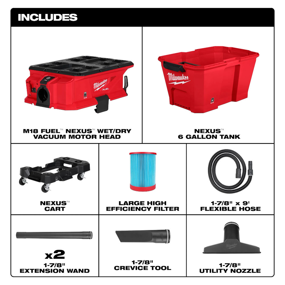 Our M18 FUEL™ NEXUS™ 6 Gallon Wet/Dry Vacuum w/ PACKOUT™ Compatibility DELIVERS CORDED PERFORMANCE with OVER 40 MIN OF CONTINUOUS CLEANING, allowing users to CLEAN ANYWHERE, WITH NO CORD LIMITATIONS. The POWERSTATE™ Brushless Motor and REDLINK PLUS™ Intelligence deliver 95 CFM and the power to clean up more common jobsite debris than 3.5 Peak HP wet/dry vacuums in the same amount of time without the corded headaches. On an M18 REDLITHIUM™ FORGE™ HD12.0 battery pack, this vacuum can clean up to 1,800 sqft. on a single charge with up to 44 minutes of continuous cleaning on max run-time mode. This cordless vacuum eliminates common corded hazards like slips, trips, and falls. The need to search for power on the job site has also been eliminated. This vacuum is quieter than leading corded competitors, allowing use in all job site environments. The M18 FUEL™ NEXUS™ 6 Gallon Wet/Dry Vacuum w/ PACKOUT™ Compatibility is part of the NEXUS™ Modular Vacuum System. This system allows users to customize their cleanup experience with interchangeable motorheads for varying power, tanks for holding capacity, carts for mobility, and add-on components to enhance the cleanup experience. The top of the product is fully compatible with the Milwaukee® PACKOUT™ Modular Storage System, allowing more convenient transportation of tools and material on, off, and around the job site.