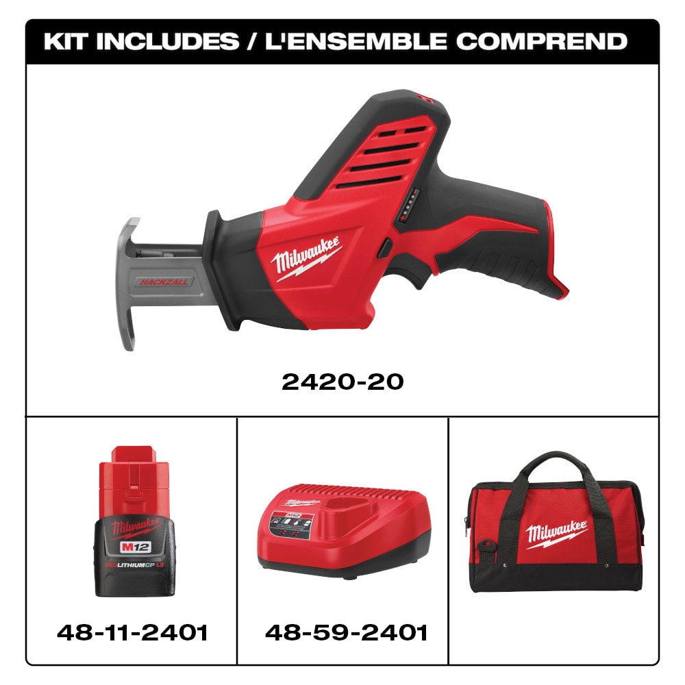 Our M12™ HACKZALL® Recip Saw Kit features a compact and lightweight design giving you superior control and versatility in tight spaces. The cordless reciprocating saw is only 11” and 2.6 lbs and is designed to give you the best cuts in tight spaces. A powerful motor delivers 0-3,000 strokes per minute and a 1/2” stroke length allowing you to quickly cut through a wide range of material such as drywall, wood, and PVC. The variable speed trigger gives you maximum cut control while the QUIK-LOK® blade clamp allows you to perform fast and easy blade changes. In addition to the cordless HACKZALL, the kit includes two M12™ REDLITHIUM™ Batteries, an M12™ charger, and a carry case.