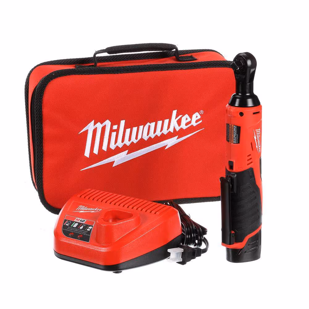 Choose the sub-compact ratchet with best-in-class power, speed and durability. The M12™ Cordless 3/8” Lithium-Ion Ratchet is the ideal tool for auto mechanics, maintenance and repair professionals looking for maximum performance and productivity in a subcompact cordless tool. It utilizes a powerful 12-volt motor to produce up to 35 ft-lbs of torque and 250 RPM, giving users the power and speed of a pneumatic ratchet without the airhose. It’s powered by the M12 REDLITHIUM™ Battery Pack, which delivers more work per charge and more work over pack life than the competitors, as well as best-in-class performance in extreme jobsite conditions. At just 10-3/4” long and 1.9 lbs, the ratchet is tool-belt portable, and features a 3/4″ low-profile head design for work in the tightest of spaces and engine bays. The variable-speed metal trigger and reinforced steel housing provide maximum control and durability with any application. The kit includes one M12 battery, a 30-minute charger, a 3/8” to 1/4″ adapter and carrying case