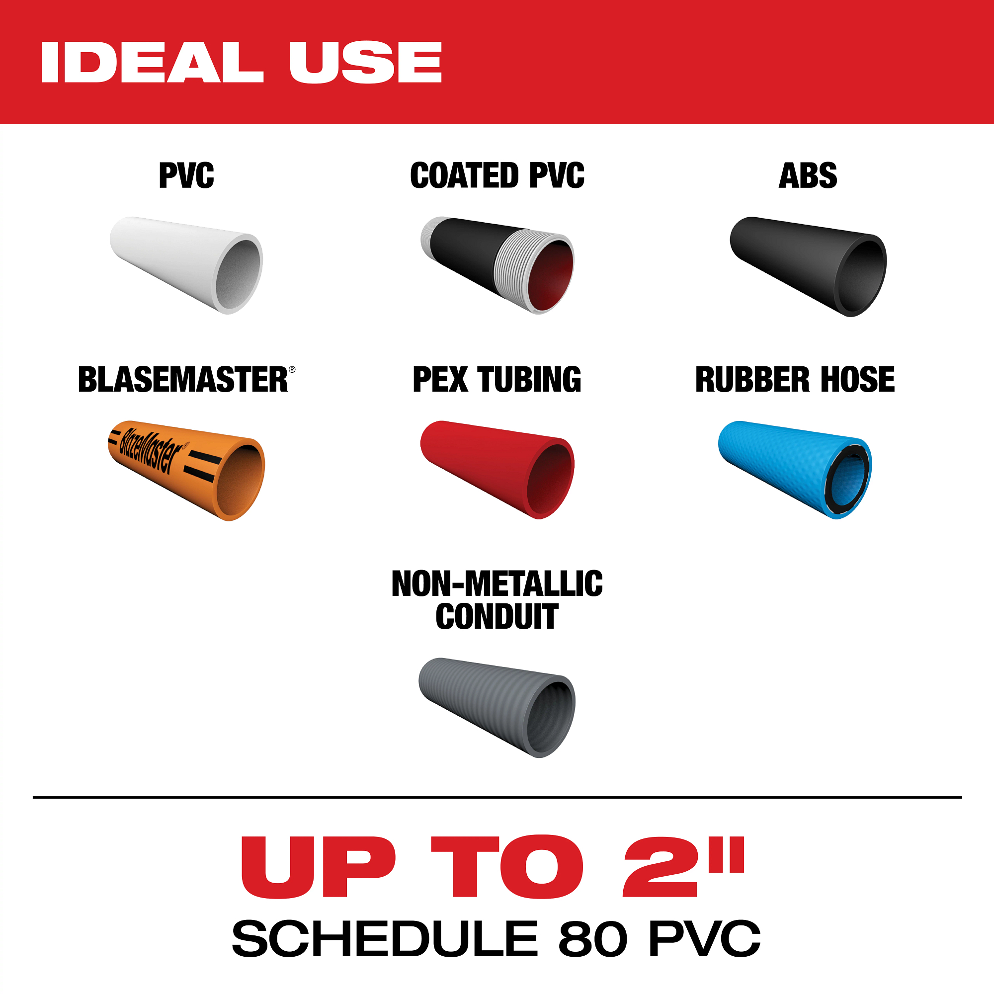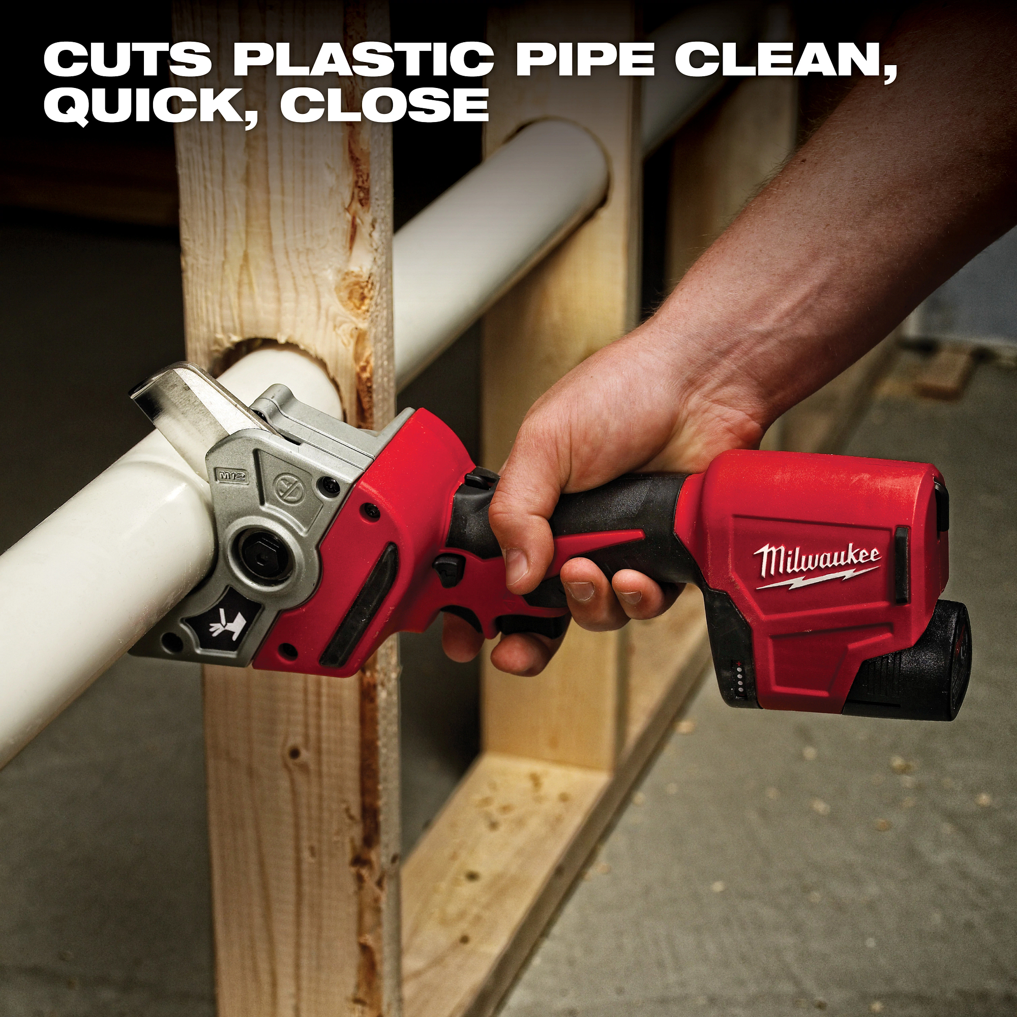 The MILWAUKEE® M12™ Plastic Pipe Shear cuts cleaner, faster, closer, and longer than traditional plastic pipe shears with over 200 cuts on one battery charge. The M12™ Plastic Pipe Shear can cut through 2” schedule 80 PVC in three seconds or less. Its razor-sharp pierce-point leaves pipe and tubing clean, burr-free, and ready for installation, minimizing the time spent on the job. Instantly open the jaw to increase productivity in repetitive cuts by using the tool’s quick blade release. Professionals can expect more work from this cordless shear with a 3mm stainless steel blade and aluminum jaw that resists impact, water, and rust. This Milwaukee pipe shear is powered by an M12™ REDLITHIUM Battery for more power and a longer run-time for maximum cuts per charge. The on-board battery fuel gauge helps monitor the charge status, so there’s less downtime on the job. This kit includes an M12™ Plastic Pipe Shear, an M12™ Battery Charger, and an M12™ REDLITHIUM™ CP1.5 Battery Pack.
