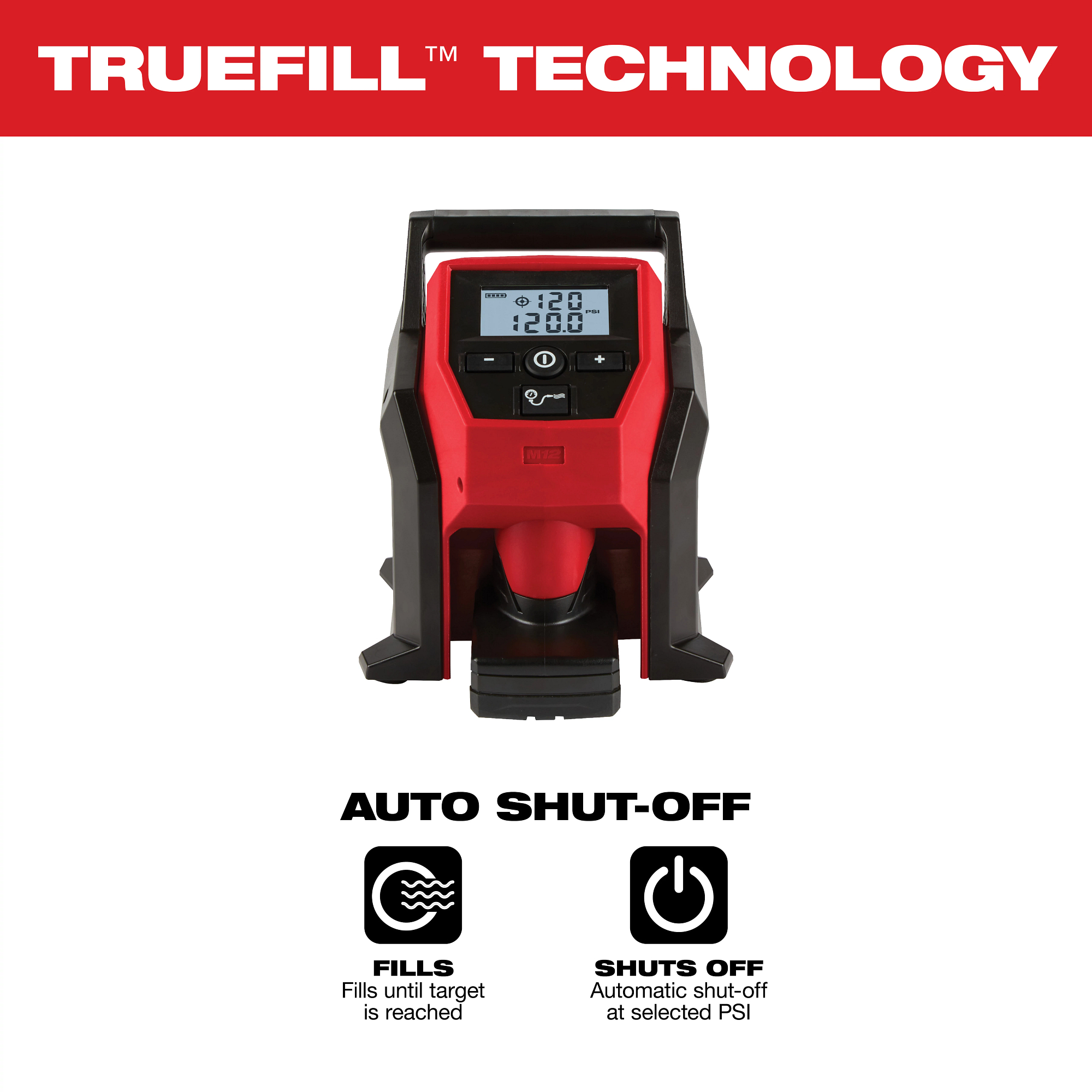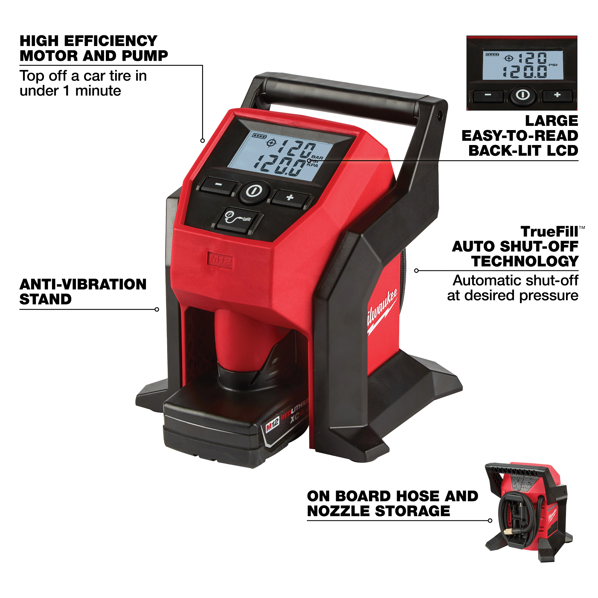 Fastest cordless tire Inflator. The Milwaukee® M12™ compact Inflator delivers fast, accurate, easy inflation with the portability to take anywhere. The Inflator has the capability to complete demanding applications like car, LT truck, and compact equipment tires, the M12™ compact Inflator gives users ultimate power and efficiency. Rated to deliver over 120PSI, the high efficiency motor and pump top-off car tires in under 1 minute. The TrueFill™ auto shut-off technology delivers highly accurate pressure, protects from overfill, and automatically senses speed of fill to deliver precise shut-off at the desired PSI. Additionally, the unit includes a large easy to read back-lit LCD, anti-vibration feet, and 26 in. hose with an all brass Schrader chuck.