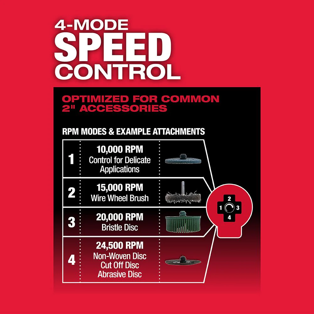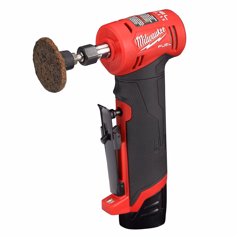 Our M12 FUELâ„¢ 1/4″ Right Angle Die Grinder Kit is the first cordless right angle die grinder that delivers the performance and size professional service mechanics demand. The die grinder delivers 20% more power than pneumatic competition and features our POWERSTATEâ„¢ Brushless Motor Technology. The cordless die grinder provides you with up to .3 HP performance, best-in-class size to help fit in tight places, and offers you greater mobility and access. The M12â„¢ die grinder features a 4-Mode speed control and responsive variable-speed trigger giving you unmatched control. In addition to the tool, this kit includes two M12â„¢ REDLITHIUMâ„¢ 2.0 batteries.
