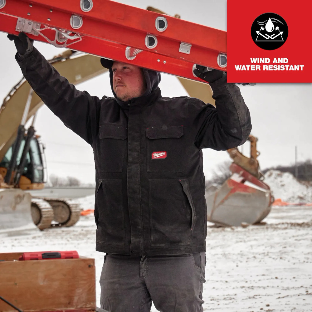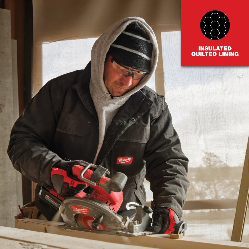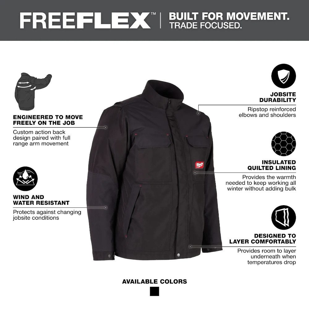 Part of our MILWAUKEE® FREEFLEX™ Collection, the Insulated Jacket is BUILT FOR MOVEMENT. Our FREEFLEX™ Jacket is designed with stretch panels across the back and built with lighter, more durable materials that maximize mobility. This durable jacket features a quilted lining and protection against wind and water to work hard in cold conditions. Focused on providing reinforcement in areas where traditional workwear fails, the FREEFLEX™ jacket provides ultimate pocket durability and resistance to abrasive materials. Milwaukee FREEFLEX™ products are developed in collaboration with feedback from users across the trades through continuous jobsite research.