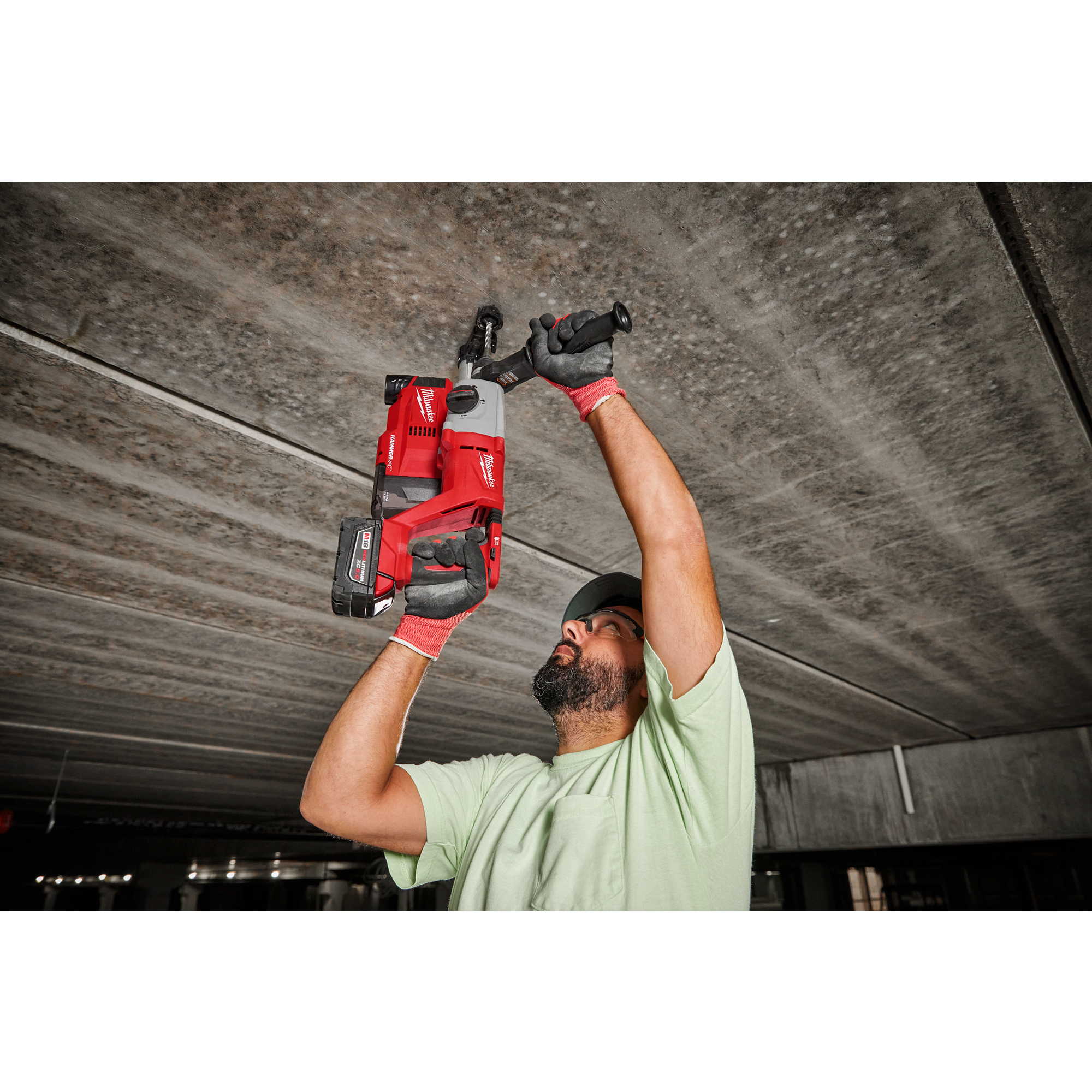 The MILWAUKEE® M18™ Brushless 1” SDS Plus D-Handle Rotary Hammer delivers Corded Power & More Productivity without the hassle of cords. The Milwaukee cordless rotary hammer drills 3/8” x 2” holes faster than corded D-Handle rotary hammers. The Brushless motor delivers 1.95 ft-lbs of impact energy, 1,270 RPM, and 4,580 BPM. The in-line D-Handle design allows access in tight spaces and provides superior balance and ergonomics for downward drilling. Milwaukee AVS Anti-Vibration System minimizes vibration for maximum comfort. The lightweight design of this tool reduces user fatigue throughout the work day at 6.9 lbs when paired with the Milwaukee M18™ REDLITHIUM™ XC5.0 Battery (not included). The Milwaukee M18™ Brushless 1” SDS Plus D-Handle Rotary Hammer drills up to (100) 3/8”x 2” holes per charge when paired with the M18™ REDLITHIUM™ XC5.0 battery (not included). For onboard OSHA Table 1 Compliance, pair with the MILWAUKEE® M12™ HAMMERVAC™ Universal Dust Extractor (2509-22). This Milwaukee cordless D-Handle rotary hammer is a part of the M18™ System, which is fully compatible with over 250 solutions.