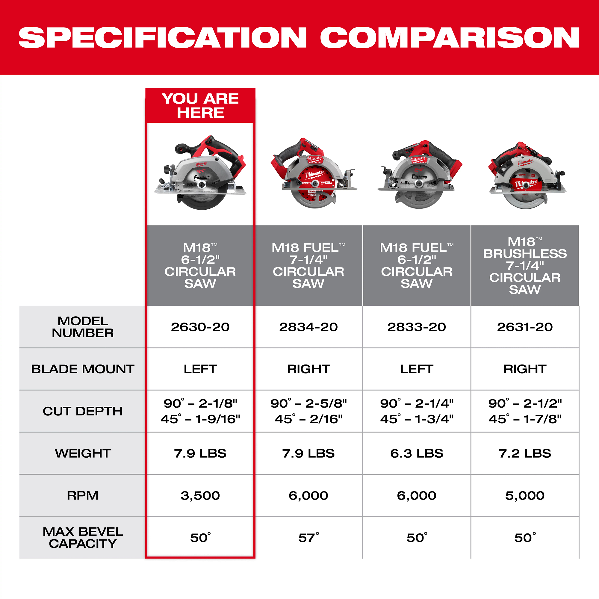 The MILWAUKEE® M18™ 6½” Circular Saw provides users with powerful lightweight cutting for a variety of applications including plumbing, electrical, framing, finishing, and carpentry. The cordless circular saw is a high-performance tool that delivers the most durability in a cordless saw. It has a powerful 3,500 RPM motor to quickly and easily cut through tough material such as LVL headers. A magnesium upper guard gives best-in-class durability to protect the blade from drops. The soft-grip handle is ergonomically designed to provide superior comfort and balance for easily controlled cuts. An easy-to-read aircraft aluminum shoe is lightweight, durable and provides greater accuracy in rip cuts while using the lightweight cordless circular saw.