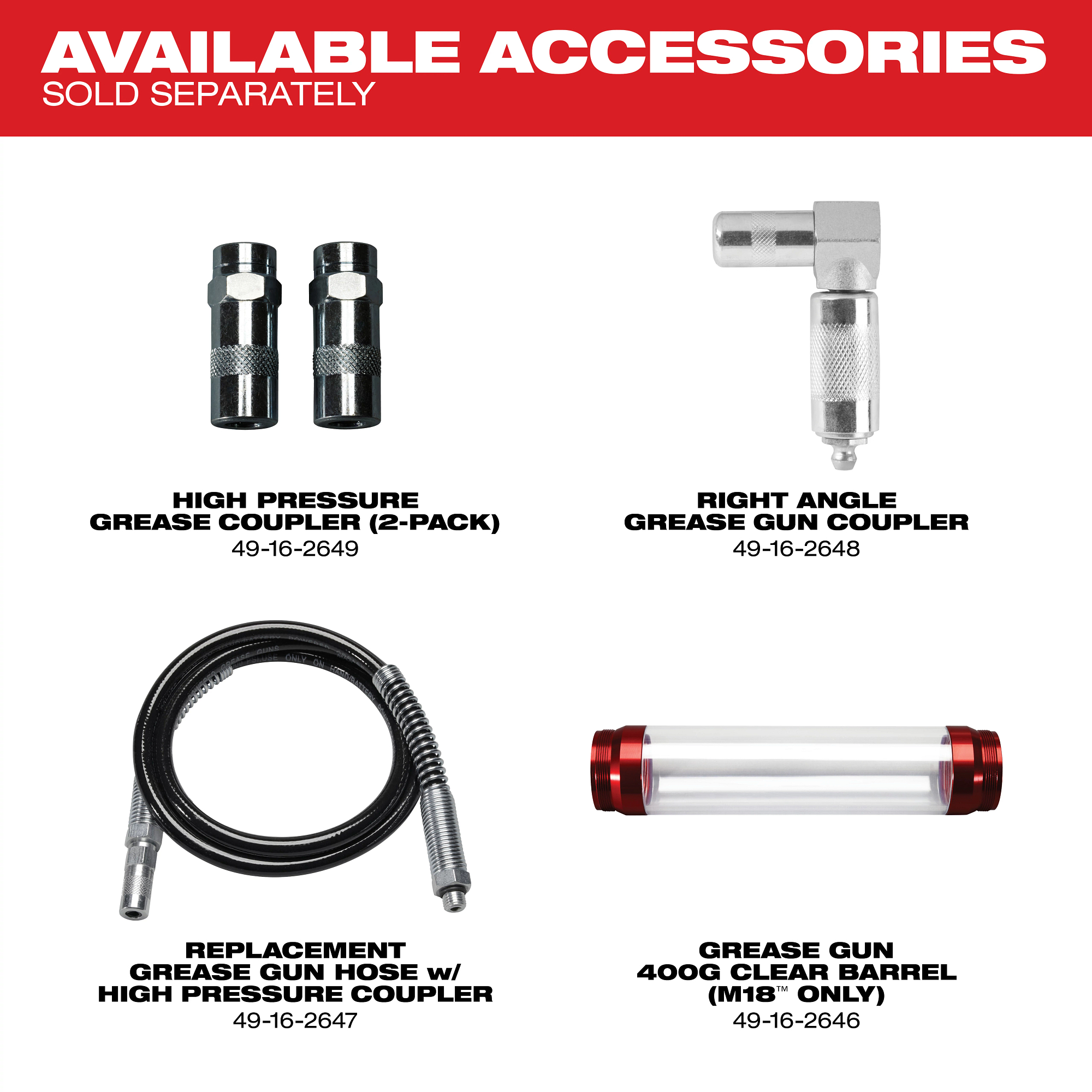 The M18™ cordless 2-speed grease gun delivers maximum pressure and unmatched versatility, offering an industry leading 10,000 PSI max operating pressure and a patent pending pre-set grease counter that allows service and maintenance professionals to dispense precise amounts of grease. The tool’s 2-speed design offers users the ability to select between max pressure and max flow rate. Other unique features include an on-board LED light, a lock-on/lock-off trigger, and a plunger rod with markings to gauge how much grease is left in the barrel. The tool’s stand up design and shoulder strap capability offer user convenience, while limiting fatigue and the 48 in. flexible hose offers greater accessibility when greasing hard to reach fittings. The new tool is also compatible with a clear barrel accessory (49-19-2646). Powered by an M18™ REDLITHIUM™ battery pack, this is the industry’s only 18 V grease gun that’s battery is compatible with a system of tools.
