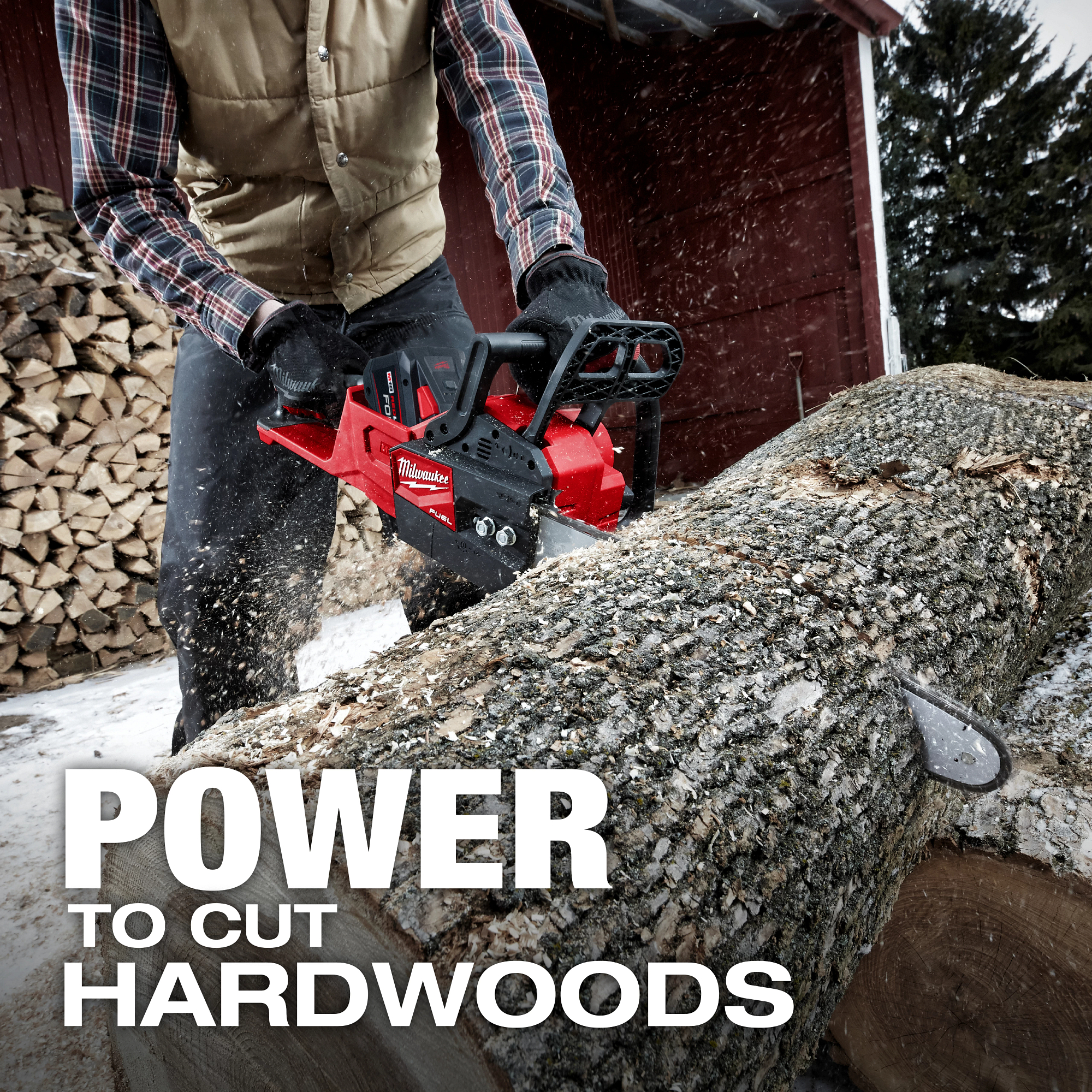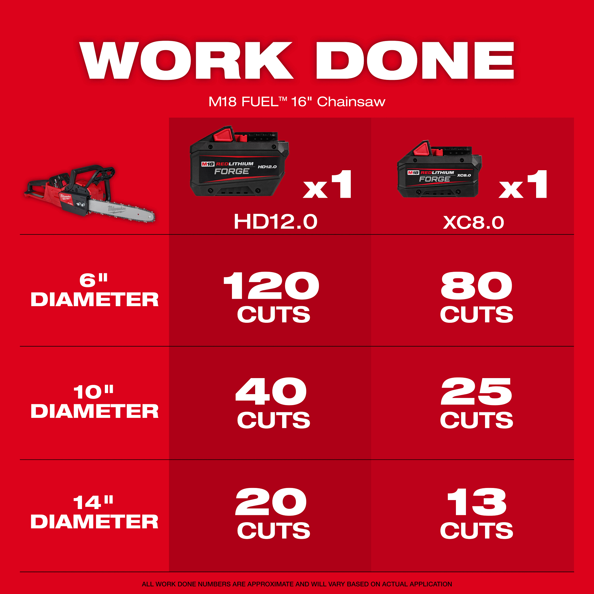 The Milwaukee M18 FUELâ„¢ 16 in. Chainsaw delivers the power to cut hardwoods, cuts faster than gas, and delivers up to 150 cuts per charge. The unit is designed to meet the performance, durability and ergonomic needs of professional landscape maintenance, power utility, and the installed M18 user. The POWERSTATEâ„¢ brushless motor maintains speed under heavy loads without bogging down to outperform small gas engines and higher voltage systems. REDLINK Plusâ„¢ intelligence ensures maximum performance and protection from overload, overheating and over discharge. When paired with the M18â„¢ REDLITHIUMâ„¢ HIGH OUTPUTâ„¢ HD12.0 battery (sold separately), the unit delivers unmatched run-time in all applications. M18 FUELâ„¢ technology allows the unit to reach full throttle in under 1 second providing ultimate control and productivity.