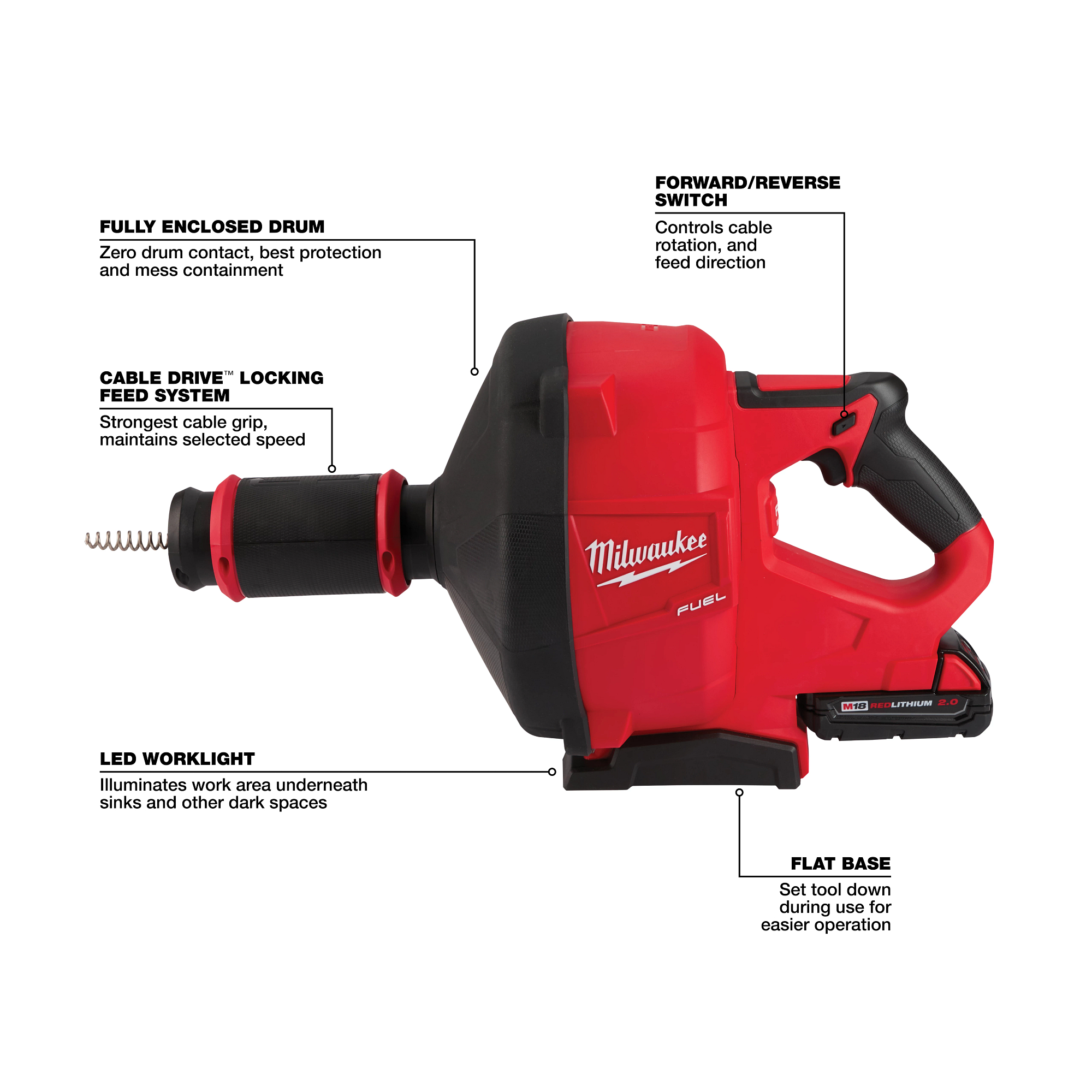 The MILWAUKEE® M18 FUEL™ Drain Snake with CABLE DRIVE™ Locking Feed System represents the next level in performance for handheld machines and is the first to bring brushless motor technology to the drain cleaning industry. The POWERSTATE™ Brushless Motor provides more clearing power than corded competitors for tough jobs through 3” drain lines. REDLINK PLUS™ Intelligence ensures maximum performance under load and improves control throughout the entire process. The REDLITHIUM™ battery pack powers through multiple jobs on a single charge, delivering cordless mobility, safety, and power supply to the drain cleaning industry. CABLE DRIVE™ Locking Feed System maintains the selected feed speed, and its twist lock design auto-adjusts to all compatible cable sizes for the best cable grip when feeding and working the clog. M18 FUEL™ Drain Snake has a fully enclosed drum to ensure the best protection and mess containment.