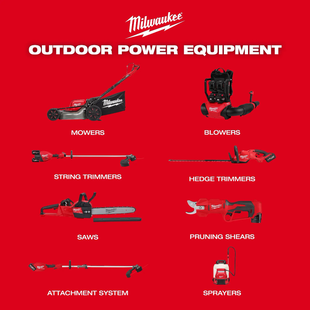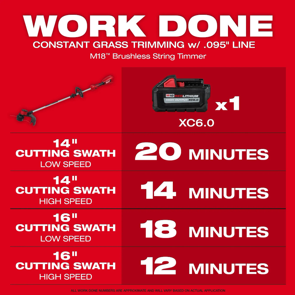 Our MILWAUKEE® M18™ Brushless String Trimmer delivers the power to clear thick brush and a lightweight design. The brushless motor provides optimal performance for grass trimming applications and provides up to 6,200 RPM to maintain cutting performance in dense grass. Paired with REDLINK™ Intelligence and an M18™ REDLITHIUM™ HIGH OUTPUT™ XC6.0 (battery included), the trimmer provides efficient power delivery, providing users with longer run-time. The trimmer features high and low speed settings with a variable speed trigger. High speed provides the power to take on demanding applications, and low speed maximizes run time with the power for standard grass trimming. The 16″ cutting swath trims more grass in a single pass, which increases the user’s productivity. The string trimmer head delivers a simple line-loading experience and can be loaded with 25′ of .080 or 20′ of .095 trimmer line in under 30 seconds. This MILWAUKEE® cordless string trimmer is a part of the M18™ System, which is fully compatible with over 300+ solutions.