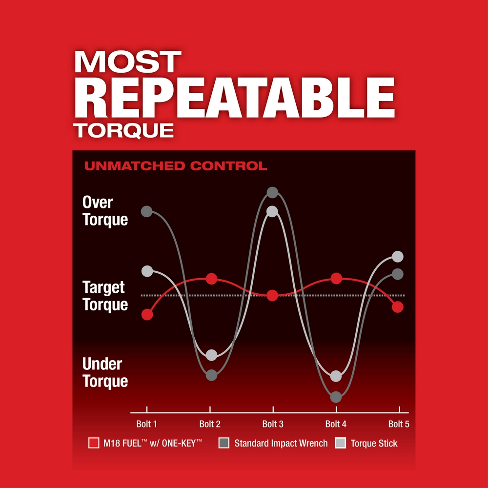 The M18 FUEL with ONE-KEY High Torque 1/2” Impact Wrench with Friction Ring provides the Most Powerful, Most Compact, and the Most Repeatable Impact Wrench in the industry! The POWERSTATE Brushless motor delivers up to 1,000ft-lbs of fastening torque and 1400ft-lbs of nut-busting torque, providing users a cordless solution that will eliminate the need for corded Impact Wrenches. The industry’s most compact cordless High Torque Impact wrench at 8.39” in length, this tool allows for more access in tight spaces. REDLINK PLUS intelligence prevents damage to the tool and battery due to overloading or overheating. REDLITHIUM batteries deliver more work per charge and more work over the life of the battery. Compatible with ONE-KEY, this is the industry’s first High Torque Impact Wrench that wirelessly connects to a smart phone to Customize, Track and Manage a tool’s performance and location. Unlimited Tool Customization allows you to connect to the tool and access predetermined set-ups for specific fasteners and materials, or have complete control over output speed and power for the specific application at hand. With ONE-KEY, users now have a tool that delivers the most repeatable torque output in the industry. Users looking for a targeted torque range now have solution that will get users close to their targeted torque value, reducing the likelihood of significant under or over torque. Users will experience less rework, less damage, and increased productivity that will get users closer to their torque target and will finish with a calibrated torque device to reach their targeted torque value. The tool’s memory supports up to 4 custom profiles that can be easily accessed with the touch of a button on the tool. Once the profiles are saved to the tool, the connection to the smart phone is no longer necessary. Your custom profiles are also saved in the cloud so that they can be accessed at any time. Integrated Tool Tracking, also available through ONE-KEY, provides full visibility to how and where tools are being used across your network of jobs and users.
