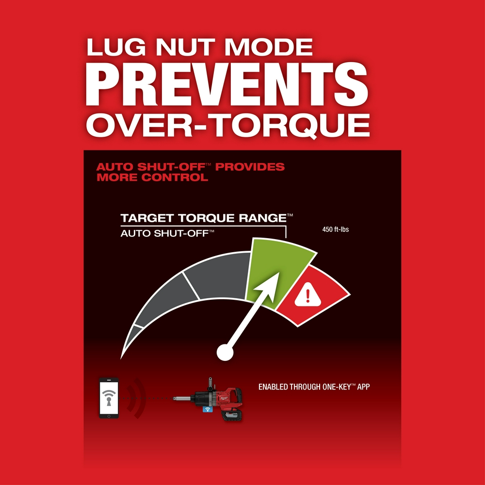 The MILWAUKEE M18 FUEL 1 in D-Handle Extended Anvil High Torque Impact Wrench w/ ONE-KEY is the world?s first cordless 1 in D-Handle High Torque Impact Wrench. The POWERSTATE Brushless Motor delivers up to 2000 ft-lbs of nut-busting torque and 1900 ft-lbs of fastening torque making this the world s most powerful cordless impact wrench able to complete the most demanding applications. With the runtime to remove and install up to 120 lug nuts on a single HIGH OUTPUT HD12 Ah battery this tool provides unmatched performance. Lug Nut Mode which can be enabled through the ONE-KEY app prevents the over-torque of lugnuts using Auto Shut-Off providing more control. The REDLINK PLUS Intelligence ensures maximum performance and protects the 6 in extended anvil impact wrench against overloads over-heating and over-discharge. M18 REDLITHIUM Battery Packs are compatible with all M18 tools providing more work per charge and more work over the life of the pack. The 4-Mode DRIVE CONTROL provides greater control over the output speed and power of the High Torque Impact Wrench. The ONE-KEY Technology allows for customization tracking and management of the impact wrench with the ability to set a repeatable torque output for maximum control.