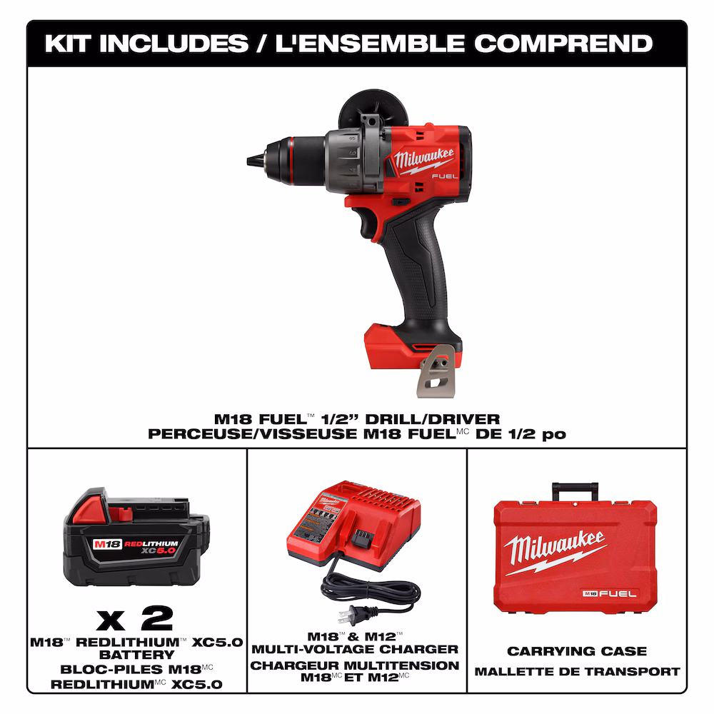 Our M18 FUEL™ ½” Drill Driver is the Industry’s Most Powerful Drill, delivering the capability to drill the largest holes at high speed into the densest materials. Our cordless drill is the Most Compact solution in its class and features AUTO STOP™ Control Mode for Enhanced Safety. The POWERSTATE™ Brushless motor delivers the most power under load to complete 2-9/16″ Self-Feed holes in dense woods for increased productivity. At only 6.9” in length, this is the most compact cordless drill in its class for the best access and maneuverability in tight spaces. The AUTO STOP™ Control Mode offers enhanced safety for the operator by preventing over-rotation in a bind-up with the best reaction time in the industry. The REDLINK PLUS™ intelligence ensures maximum performance and protects from overloads, heating, and over-discharge. Our REDLITHIUM™ XC5.0 Battery Pack delivers more work per charge and more work over the life of the pack when compared to competitors. The all metal ratcheting chuck is the best-in-class. This provides increased grip strength, durability and corrosion resistance.
