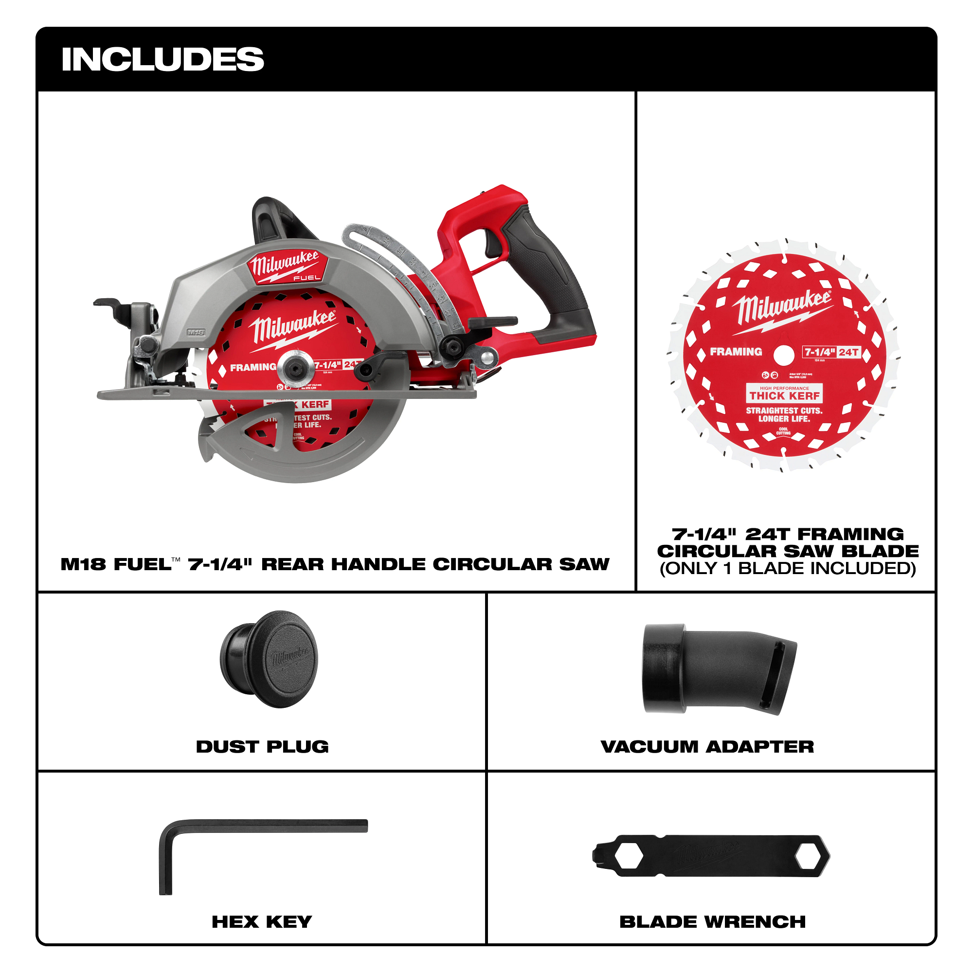 Designed for the professional carpenter, remodeler, and general contractor, the M18 FUEL™ 7-1/4″ Rear Handle Circular Saw from MILWAUKEE® delivers class-leading performance. Utilizing the latest in cordless technology, this saw provides users with the power to complete more demanding applications and the cut speed to achieve greater productivity. The POWERSTATE™ Brushless Motor provides this worm drive style saw with 6,000 RPM, maintaining high speed under load, providing users the ability to complete their most demanding applications efficiently. Breakthrough advances in REDLINK PLUS™ Intelligence ensure maximum tool performance and protection from overload, overheating, and over-discharge. Paired with the M18 REDLITHIUM™ FORGE™ HD12.0 Battery, this saw provides up to 700 cuts per charge while maintaining full compatibility with all M18 REDLITHIUM™ batteries. The lightweight and compact design, paired with premium ergonomics, makes this saw perfect for all-day use on the job site. For added productivity, this saw contains positive bevel detents and depth detents. A multi-sized rafter hook allows you to store the saw on different materials. Additionally, the saw has an electric blade break, rotational dust port, LED work light, and all magnesium guards and shoe, keeping you productive and providing durability to handle the toughest job site conditions.