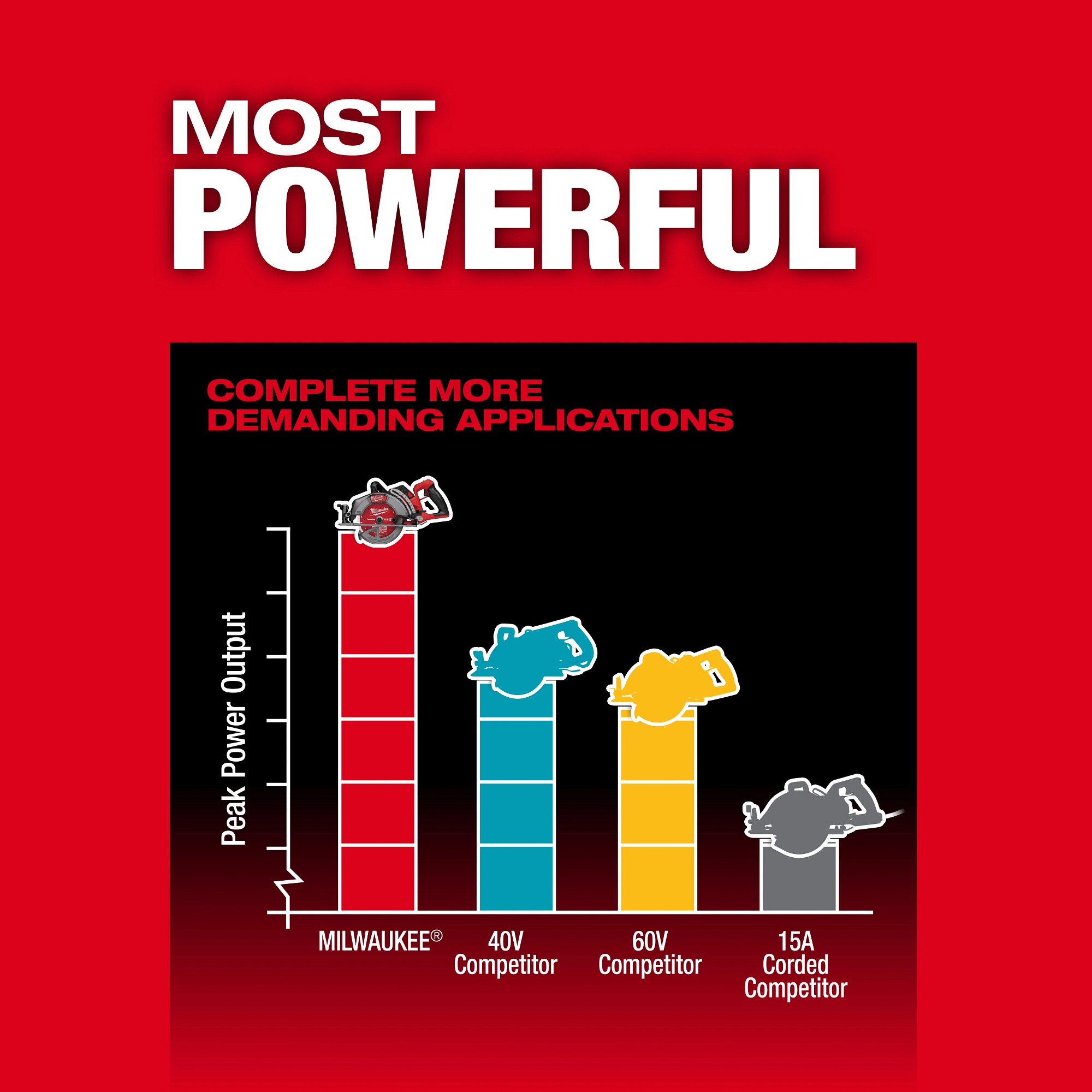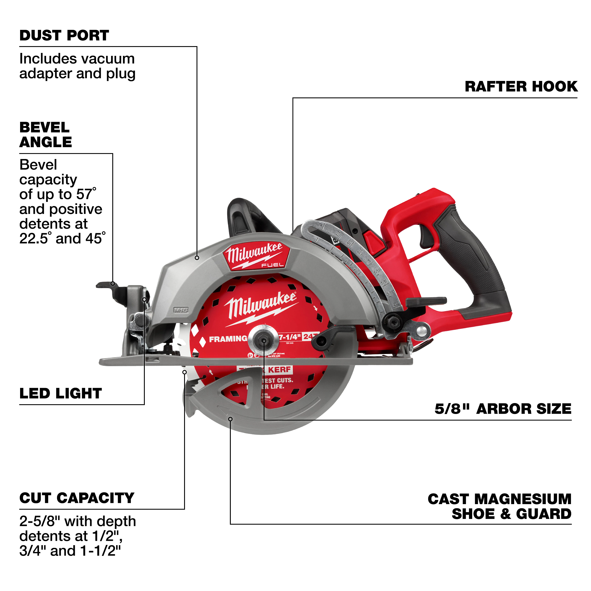 Designed for the professional carpenter, remodeler, and general contractor, the M18 FUEL™ 7-1/4″ Rear Handle Circular Saw from MILWAUKEE® delivers class-leading performance. Utilizing the latest in cordless technology, this saw provides users with the power to complete more demanding applications and the cut speed to achieve greater productivity. The POWERSTATE™ Brushless Motor provides this worm drive style saw with 6,000 RPM, maintaining high speed under load, providing users the ability to complete their most demanding applications efficiently. Breakthrough advances in REDLINK PLUS™ Intelligence ensure maximum tool performance and protection from overload, overheating, and over-discharge. Paired with the M18 REDLITHIUM™ FORGE™ HD12.0 Battery, this saw provides up to 700 cuts per charge while maintaining full compatibility with all M18 REDLITHIUM™ batteries. This saw also comes with a 7-¼” 24T Thick Kerf Framing Circular Saw Blade, offering the straightest cuts and longer life. The lightweight and compact design, paired with premium ergonomics, makes this saw perfect for all-day use on the job site. For added productivity, this saw contains positive bevel detents and depth detents. A multi-sized rafter hook allows you to store the saw on different materials. Additionally, the saw has an electric blade break, rotational dust port, LED work light, and all magnesium guards and shoe, keeping you productive and providing durability to handle the toughest job site conditions.