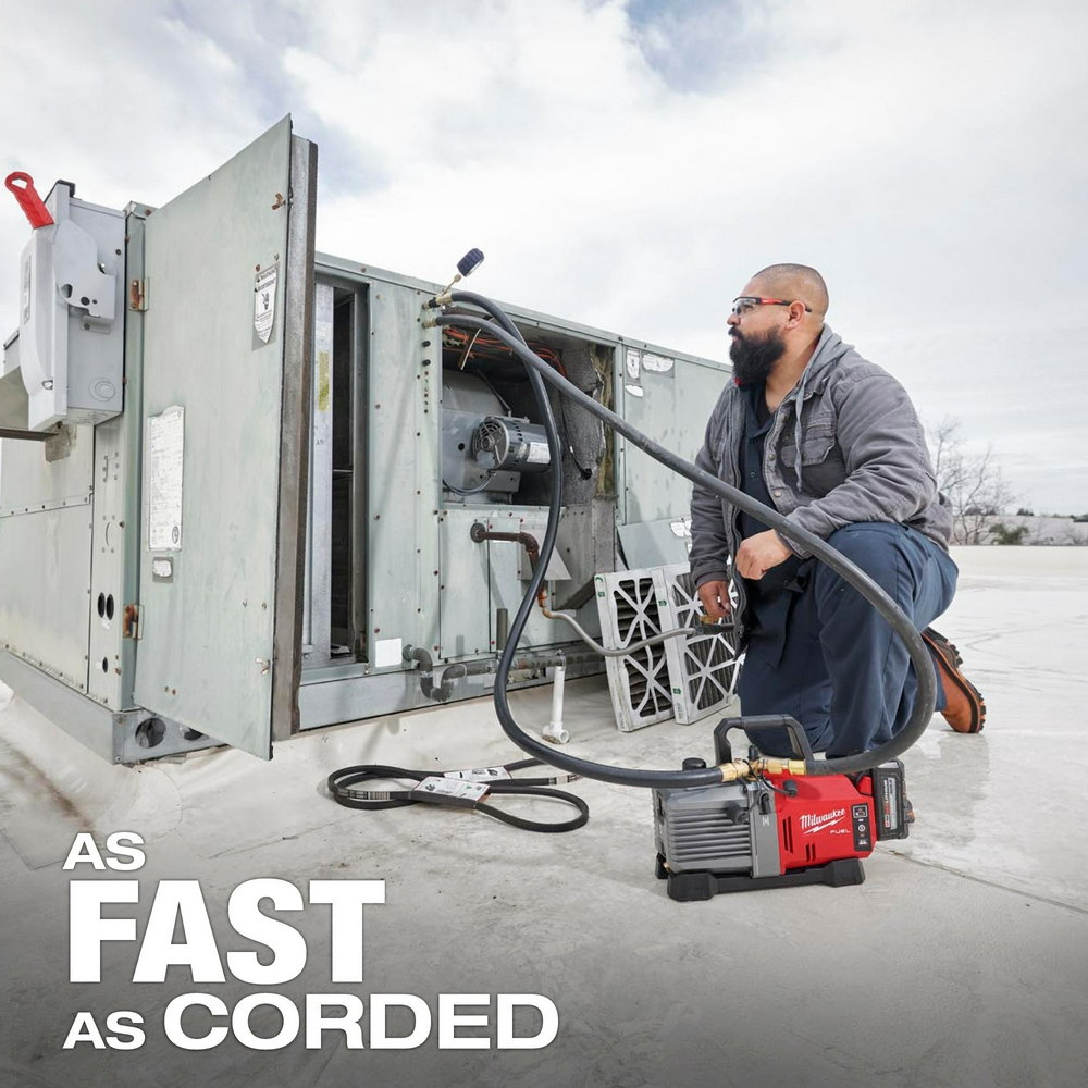 The M18 FUEL 5 CFM Vacuum Pump eliminates the hassle of cords and provides instant power for fast evacuations. Powered by M18 REDLITHIUM, this pump delivers the runtime to complete multiple jobs on one charge. With the innovation of manifold mode, the M18 FUEL 5 CFM Vacuum Pump allows you to maximize your speed and runtime in manifold setups, enabling up to 90 minutes of runtime per charge. The vacuum pump features a POWERSTATE Brushless Motor to enable corded speed during system pulldowns. The pump’s 1/2″, 3/8″, and 1/4″ port offerings deliver fast evacuations, especially when used with large hoses. The M18 FUEL 5 CFM Vacuum Pump is equipped with REDLINK PLUS Intelligence to ensure maximum performance and protection from overload.