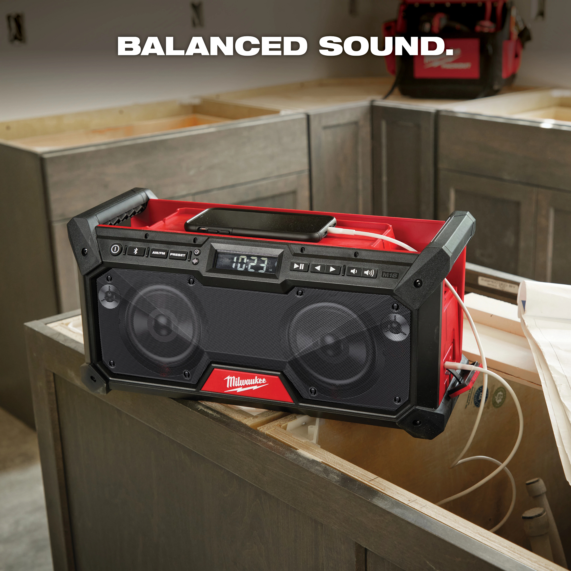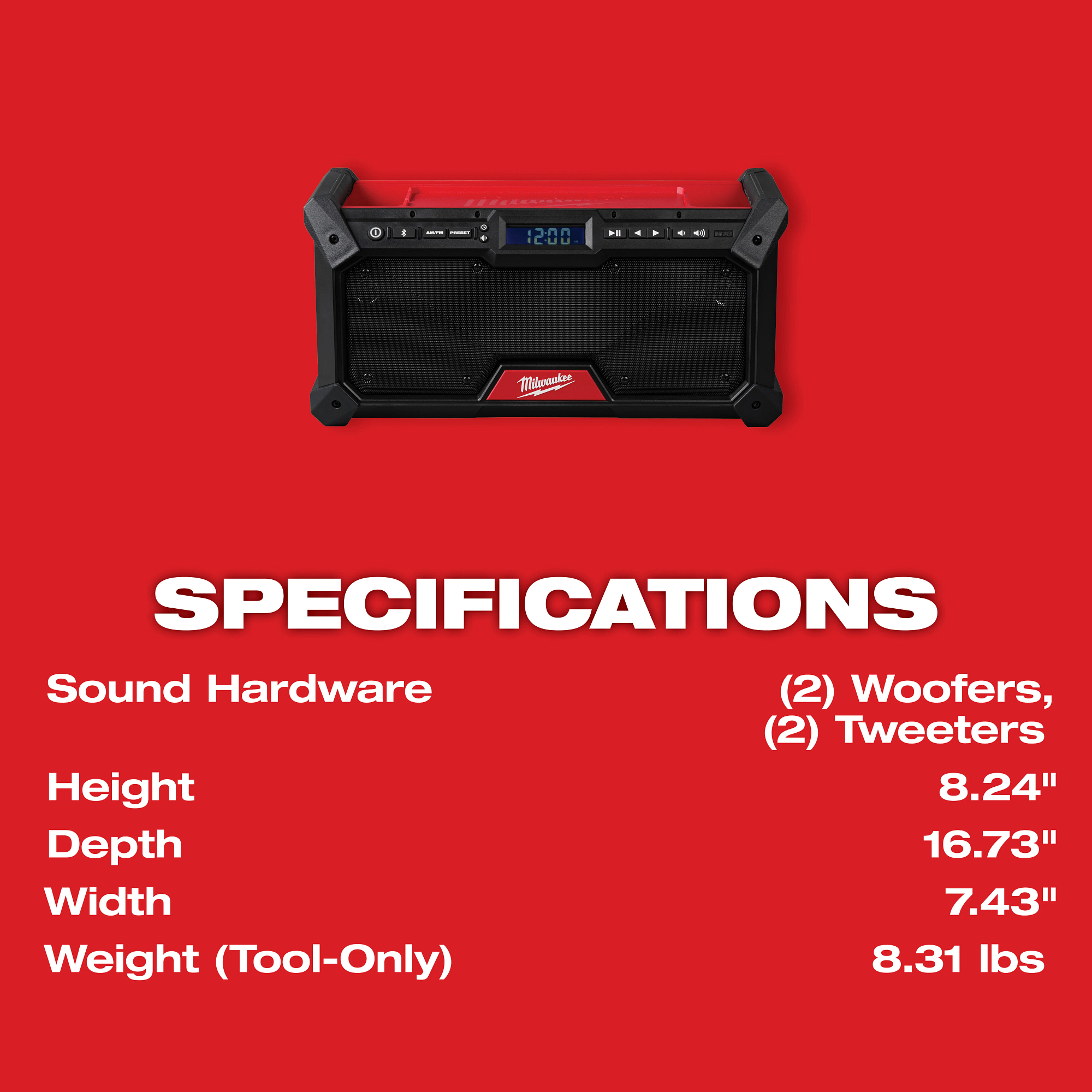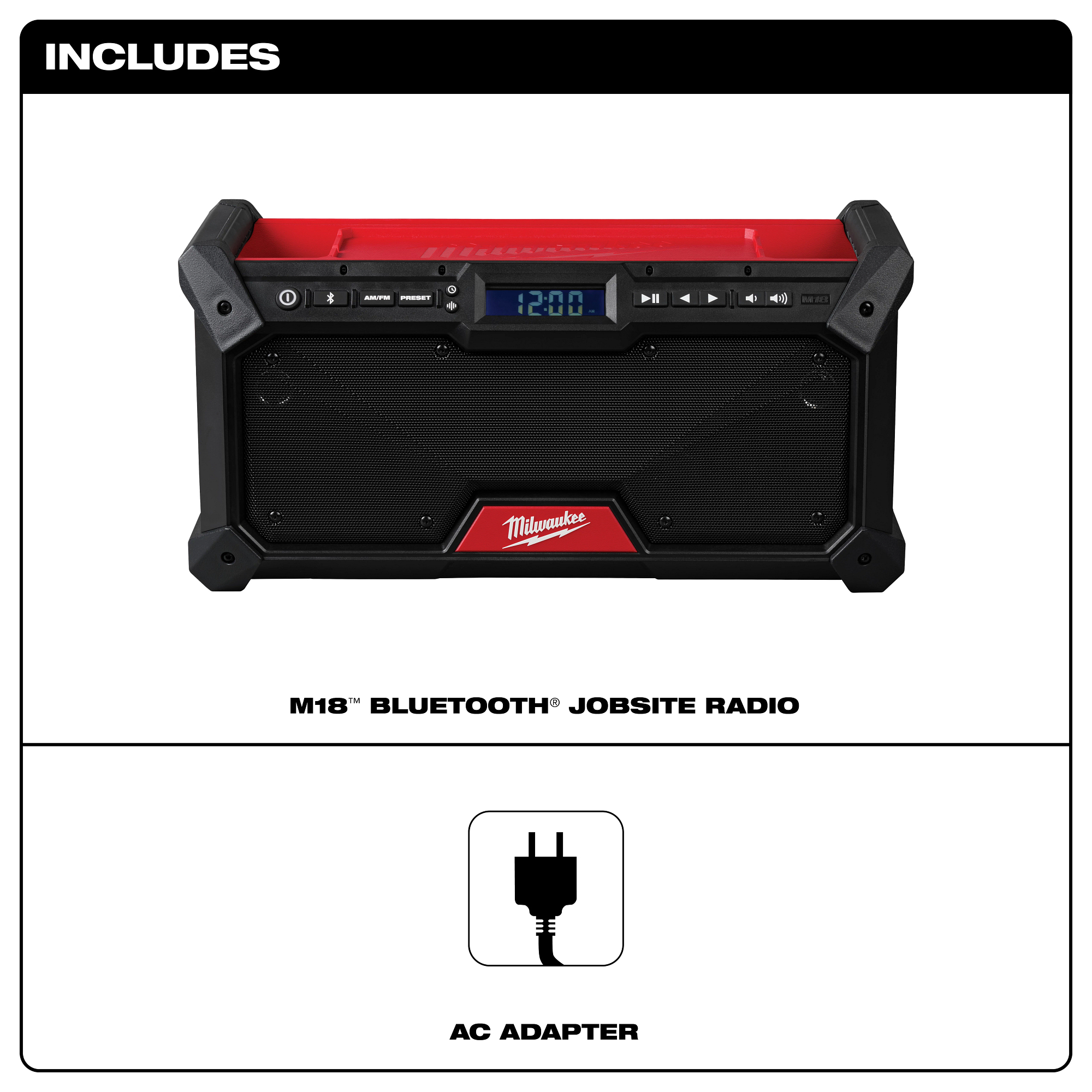 The MILWAUKEE® M18™ Bluetooth® Jobsite Radio features dual 3.5” woofers and 2 high range tweeters to provide a BALANCED SOUND experience. Bluetooth® 5.0 provides up to 120 ft of range to keep you connected. Equipped with AM/FM capabilities and 18 presets, tune in wherever the job takes you. Built-in equalizer settings allow you to customize the bass and treble to your preferred sound. BUILT FOR THE JOBSITE the bluetooth radio provides up to 13 hours of runtime at MAX volume on a MILWAUKEE® M18™ XC5.0 battery. The durable design & metal grille withstands demanding jobsite environments and delivers water, dust, and impact resistance. Charge up personal devices with USB-C 3.0A device charging. Power the radio with any MILWAUKEE® M18™ battery or the provided AC Adapter for complete versatility. The M18™ Bluetooth® Jobsite Radio delivers BALANCED SOUND that is BUILT FOR THE JOBSITE.