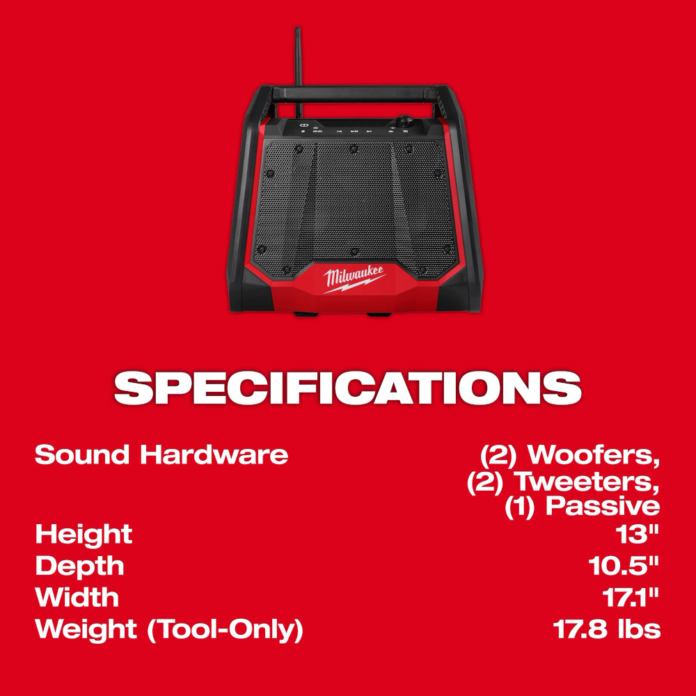 The M18™ Bluetooth® Jobsite Radio + Charger delivers POWERFUL, DYNAMIC SOUND. Featuring (2) 4.48” woofers and (2) 1.21″ high-frequency tweeters, this radio is built to deliver optimized sound for large spaces. Bluetooth® 5.3 provides up to 200 feet of range to keep you connected throughout the job site. AUDIO-LINK technology allows you to wirelessly connect and play music across multiple compatible Milwaukee® devices (over 200+), creating a larger sound experience. Powered by an M18™ REDLITHIUM™ XC5.0 Battery, this radio provides up to 8 hours of runtime at 100% volume. With built-in equalizer settings, you can customize your own preferred sound experience. This M18™ Bluetooth® Jobsite Radio + Charger also features built-in M18™ battery charging and USB-C charging for personal devices. Engineered for the job site, this radio is fully compatible with the PACKOUT™ Modular Storage System and is built to handle tough conditions with impact, dust, and water resistance.