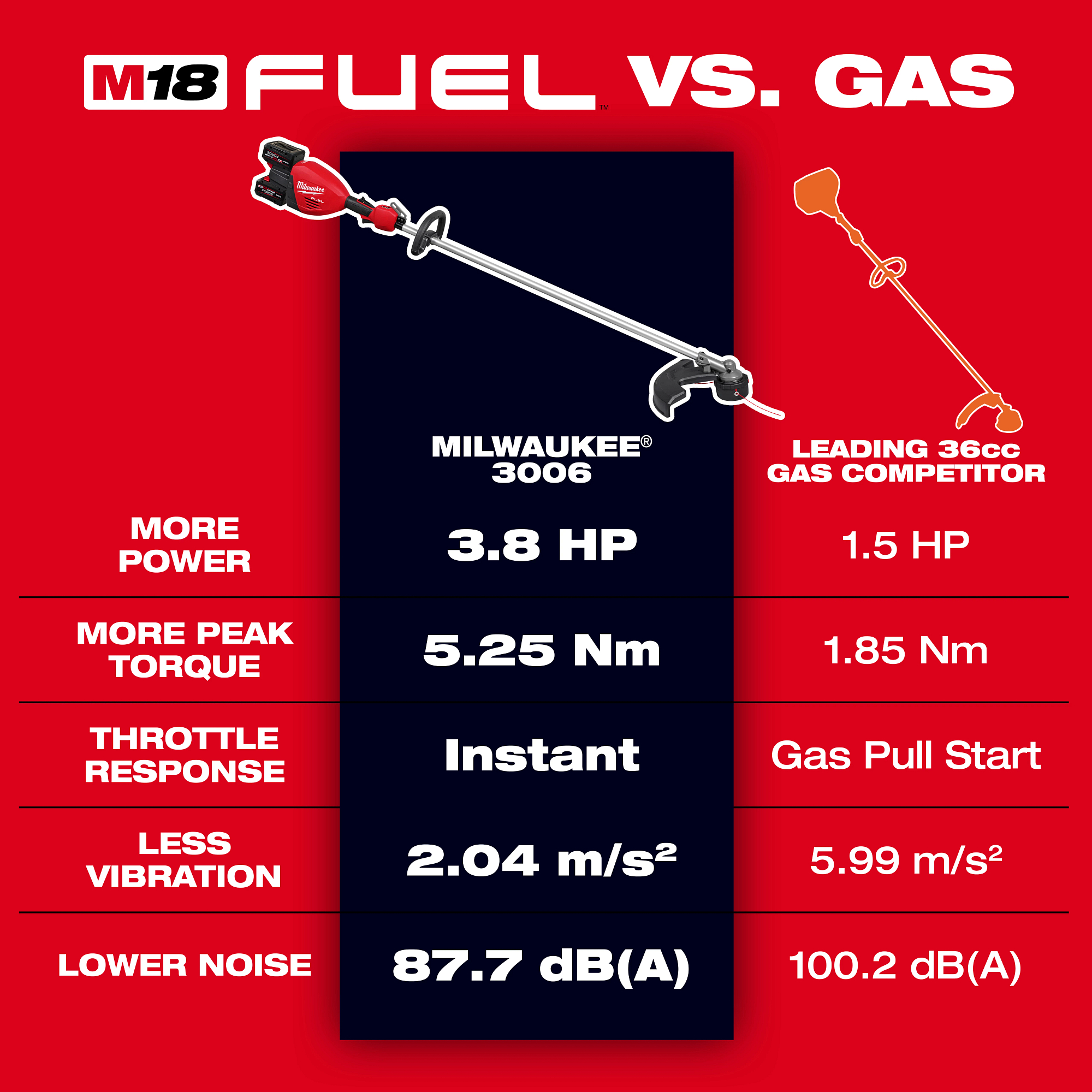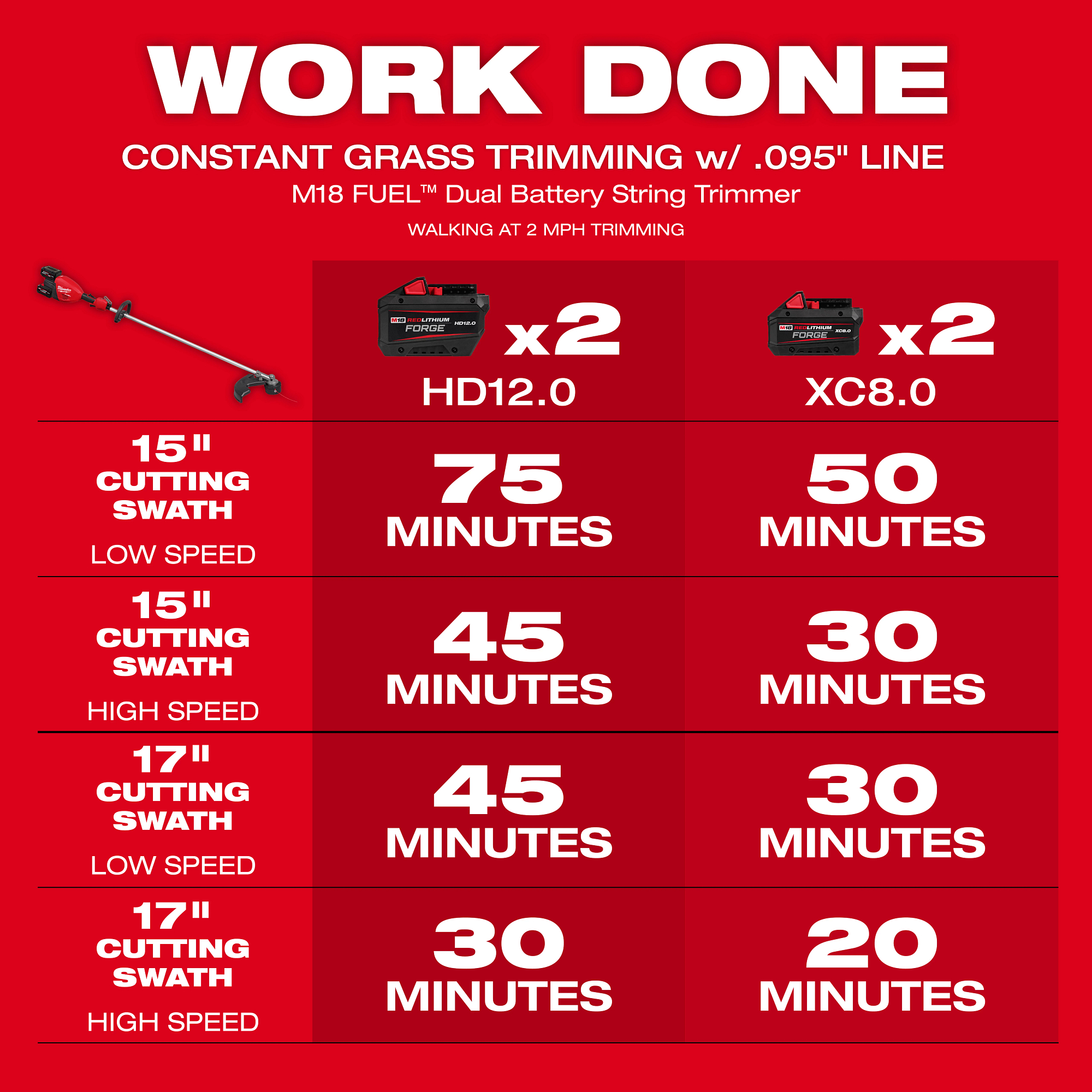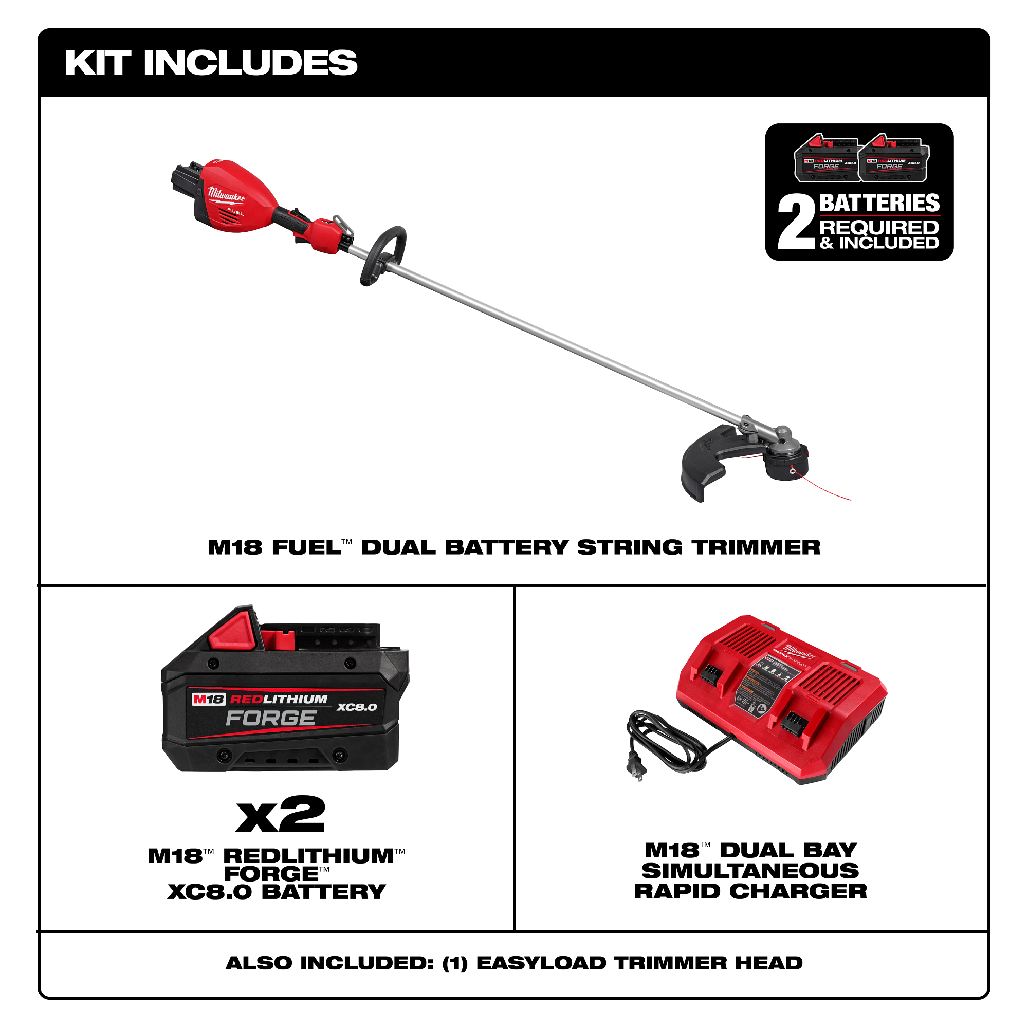 The MILWAUKEE® M18 FUEL™ 17″ Dual Battery String Trimmer meets the performance, durability, and ergonomic needs of landscape maintenance professionals. The string trimmer provides the Highest Power, delivering the most peak torque compared to leading professional gas and battery string trimmers. This string trimmer provides users with the Fastest Clearing, cutting through the most demanding applications while maintaining the highest string speed. The POWERSTATE™ Brushless Motor and advanced electronic package allow the string trimmer to reach Full Throttle in Under 1 Second, boosting control and productivity. The REDLINK PLUS™ Intelligence enables full-circle communication between the tool and battery, providing you with unmatched levels of performance, protection, and productivity. The advanced electronic package also delivers high and low speeds, and a variable speed trigger giving you ultimate control over the power range. The string trimmer requires (2) M18™ REDLITHIUM™ Batteries for operation and is optimized to be used with M18™ REDLITHIUM™ HIGH OUTPUT™ batteries. The M18™ REDLITHIUM™ HIGH OUTPUT™ XC8.0 Battery gives you best-in-class performance and run-time in all applications. The Easy Load Trimmer Head provides an easy line loading experience and the ability to load up to 25′ of trimmer line in under 30 seconds. The M18 FUEL™ 17″ Dual Battery String Trimmer is fully compatible with 250+ solutions on the M18™ system.
