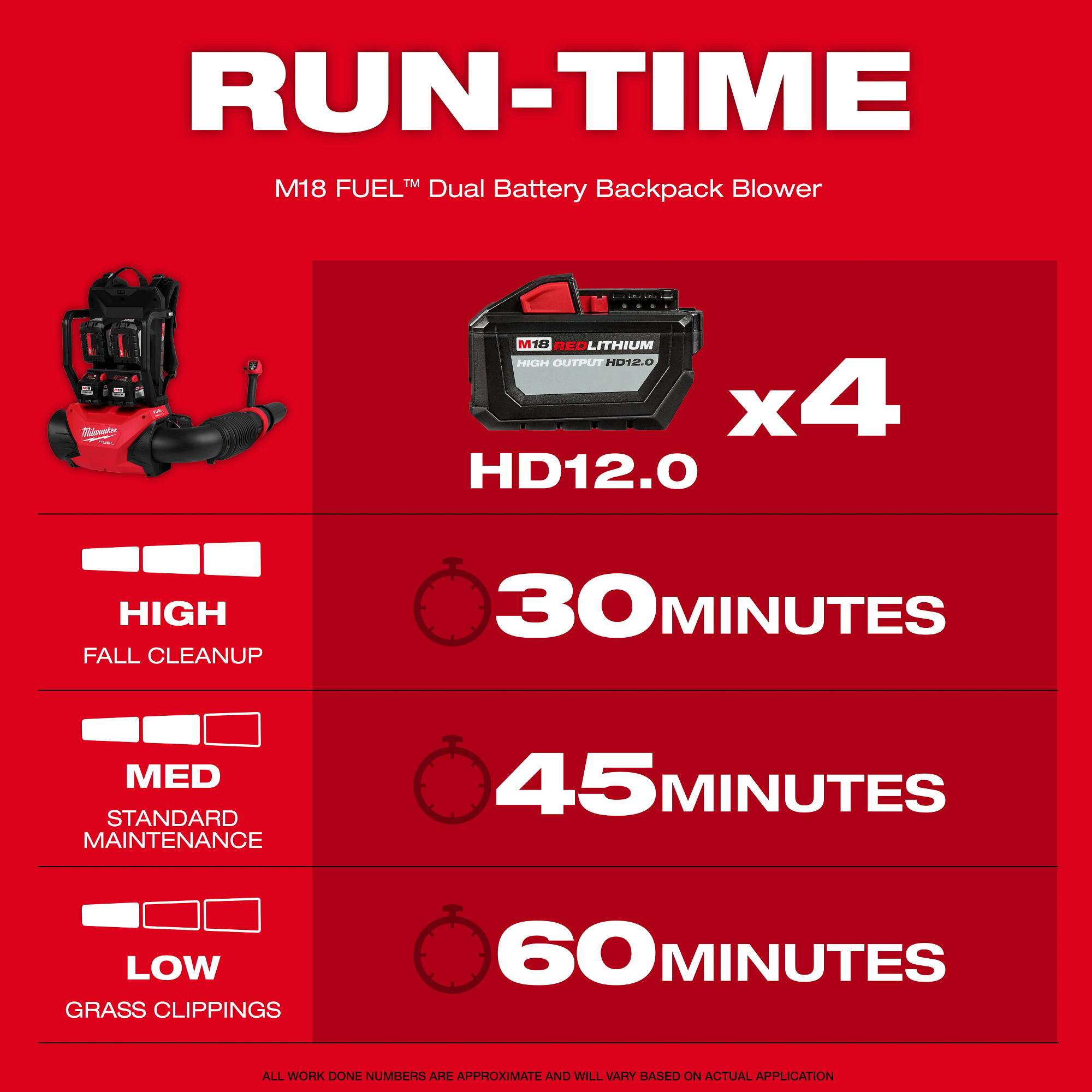 The MILWAUKEE® M18 FUEL™ Dual Battery Backpack Blower is designed for outdoor trades, delivering a higher blowing force than up to 60cc gas. The POWERSTATE™ Brushless Motor Delivers a constant 650 CFM, 155 MPH, and 20.5 Newtons of blowing force and reaches full throttle in under one second, boosting productivity and control. This battery-powered blower requires (2) M18™ REDLITHIUM™ Batteries for operation while providing (2) additional battery terminals to extend runtime. When using the included (4) M18™ REDLITHIUM™ HIGH OUTPUT™ 12.0 Batteries, the blower delivers 30 to 60 minutes of continuous use based on the selected mode. This adjustable battery setup allows the operator to adapt the number of batteries for either lighter weight in quicker clean-ups or longer runtime in extended clearing applications. With a customizable battery configuration combined with a fully adjustable harness, mode select, telescoping nozzle, variable speed trigger, and low noise level of just 62dB(A) this backpack blower provides the most adaptive design and comfort to meet the wide range of application and operator needs. The Cordless M18 FUEL™ Dual Battery Backpack Blower is part of the M18™ System, fully compatible with over 250+ solutions.