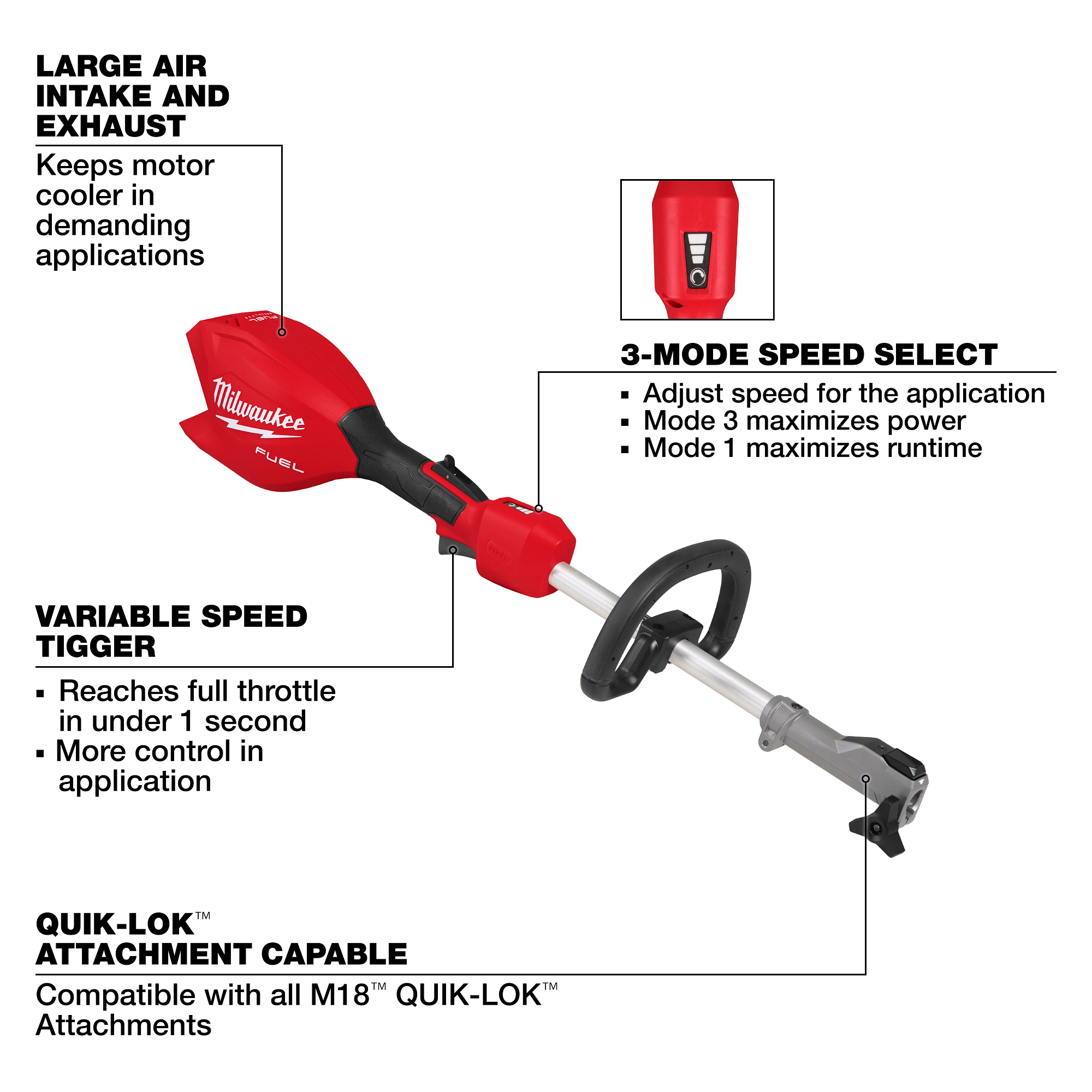 Designed to meet the needs of landscape maintenance professionals, the MILWAUKEE® M18 FUEL™ Power Head w/ QUIK-LOK™ provides you with more power than 31cc gas competitors, enabling the capability to take on a variety of demanding applications. The Power Head is part of the M18 FUEL™ QUIK-LOK™ Attachment System, the industry’s most capable attachment system. For maximum productivity, the power head reaches full throttle in under one second.