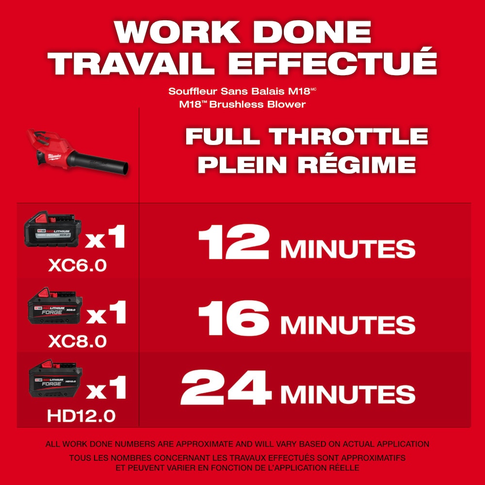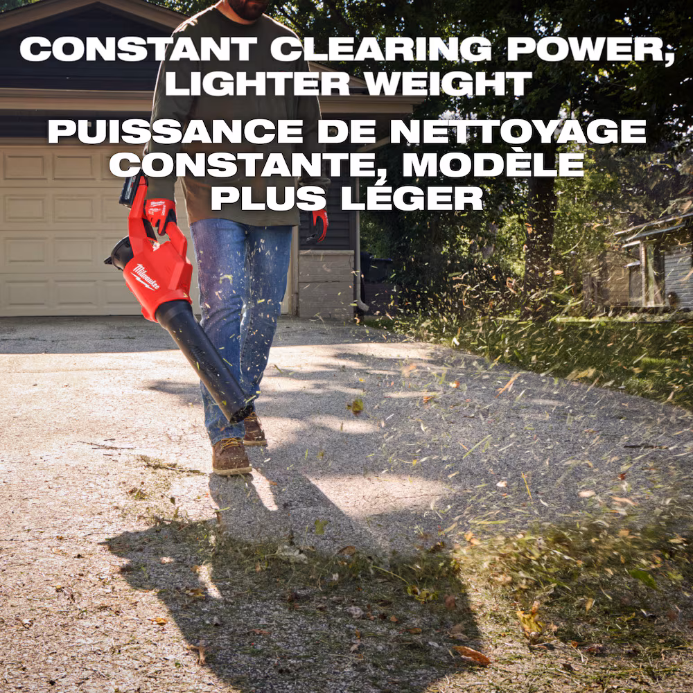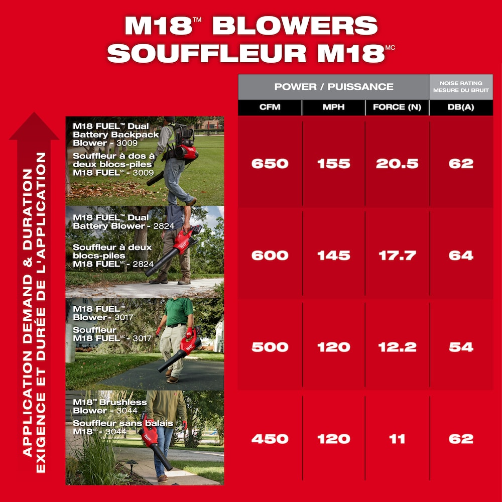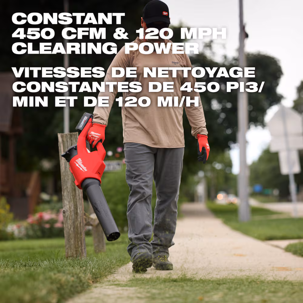 Our M18â„¢ Brushless Blower delivers constant clearing power with a lighter weight design that enhances user comfort and control. Leveraging a brushless motor, this brushless blower delivers powerful performance with 450 CFM, 120 MPH, and 11 Newtons of blowing force. The M18 Brushless Blower operates quietly at just 62 dB(A), helping users minimize disruption during use. Weighing just 4.4 lbs (tool only), this blower helps minimize fatigue during extended use. It features a variable speed trigger and a lock-on button for more control and added convenience. The lock-on function allows users to maintain full throttle without continuously holding the trigger and reducing hand strain during longer applications. The M18â„¢ Brushless Blower is fully compatible with over 300+ solutions on the M18â„¢ system.