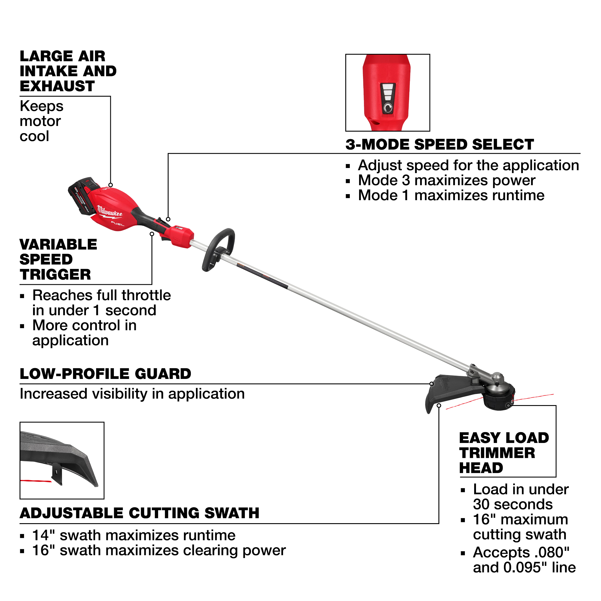 The MILWAUKEE® M18 FUEL™ 16″ String Trimmer is designed for the landscape maintenance professional. The POWERSTATE™ Brushless Motor™ delivers more power than 31cc gas, maintaining speed in demanding applications without bogging down, enabling you to complete routine maintenance and thick brush clearing jobs faster. The motor has an advanced air-cooling system to sustain demanding applications for longer, increasing user productivity. This fixed shaft string trimmer is also more balanced and lighter weight, reducing fatigue and increasing control. The motor is positioned in the rear of the trimmer to provide the best combination of power and maneuverability. The advanced electronics package allows the tool to reach full throttle in under 1 second, provides 3 speeds, and a variable speed trigger, maximizing productivity. REDLINK PLUS™ Intelligence enables full-circle communication between the tool and battery, providing you with unmatched levels of performance, protection, and productivity. The Easy Load Trimmer Head provides the ability to load up to 25′ of trimmer line in under 30 seconds. This string trimmer is optimized for use with an M18™ REDLITHIUM™ FORGE™ XC12.0 Battery to maximize performance and run time. The M18 FUEL™ 16″ String Trimmer is part of the M18™ system which is fully compatible with over 275+ tools.