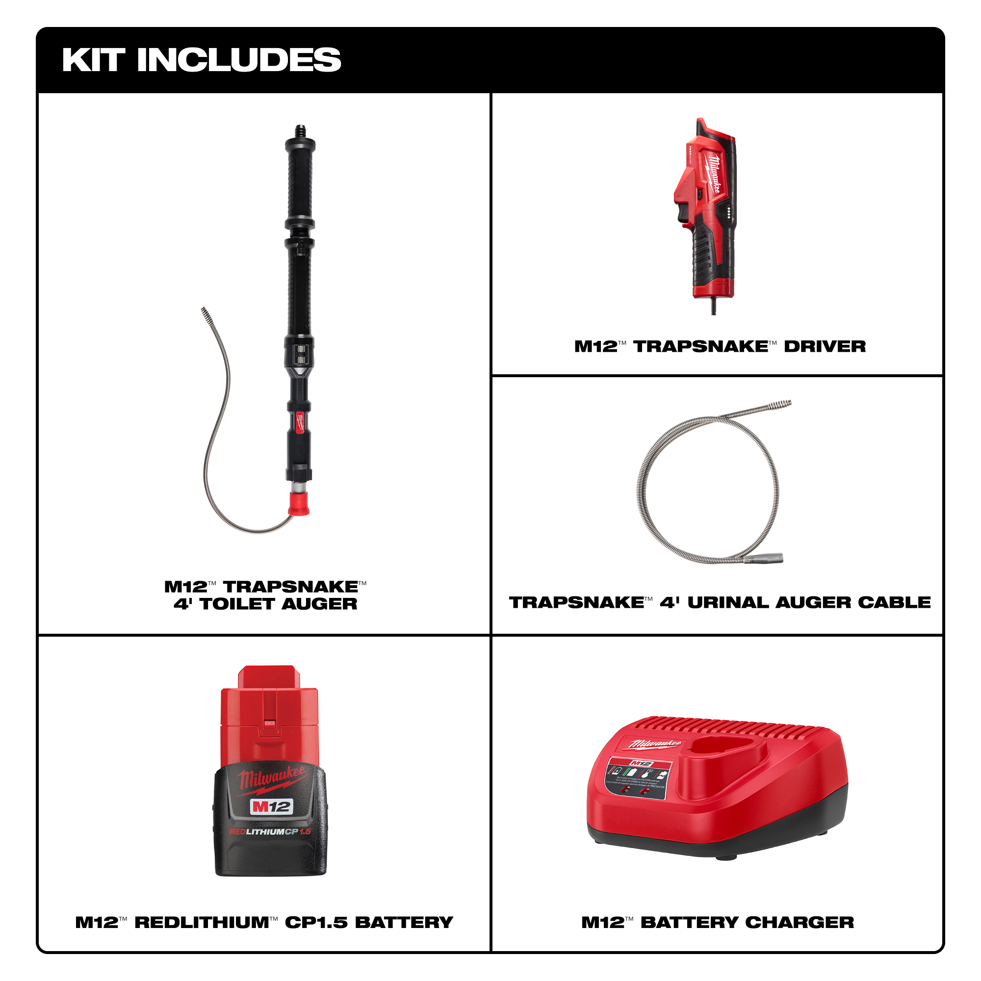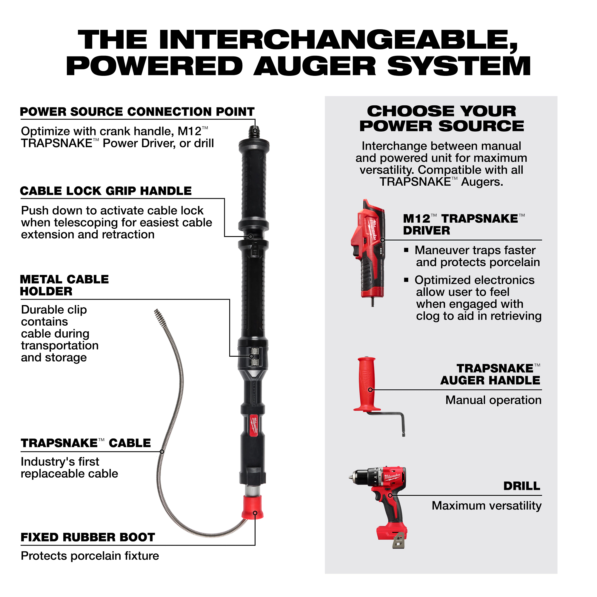 The MILWAUKEE® M12â„¢ TRAPSNAKEâ„¢ 4′ Urinal Auger is the service plumbers and facility maintenance crews’ ideal solution for unclogging urinals and floor traps. Powered by the MILWAUKEE® M12â„¢ TRAPSNAKEâ„¢ Driver, the first powered unit optimized for the challenges of porcelain fixtures, this unit delivers power and speed to work through tough clogs in tight traps. Still, it has optimized electronics that protect the fixture from the auger and allow the user to feel when engaged with a blockage. This Milwaukee urinal auger features a number of industry firsts including a fixed rubber boot for maximum porcelain protection, an integrated locking mechanism that holds the cable in place for easy telescoping extension, and replaceable cables to maximize the longevity of the tool. Part of the TRAPSNAKEâ„¢ Porcelain Auger System, users can interchange the M12â„¢ TRAPSNAKEâ„¢ Driver with the auger handle or use with other auger attachments for versatility and capabilities never seen before in a urinal auger.