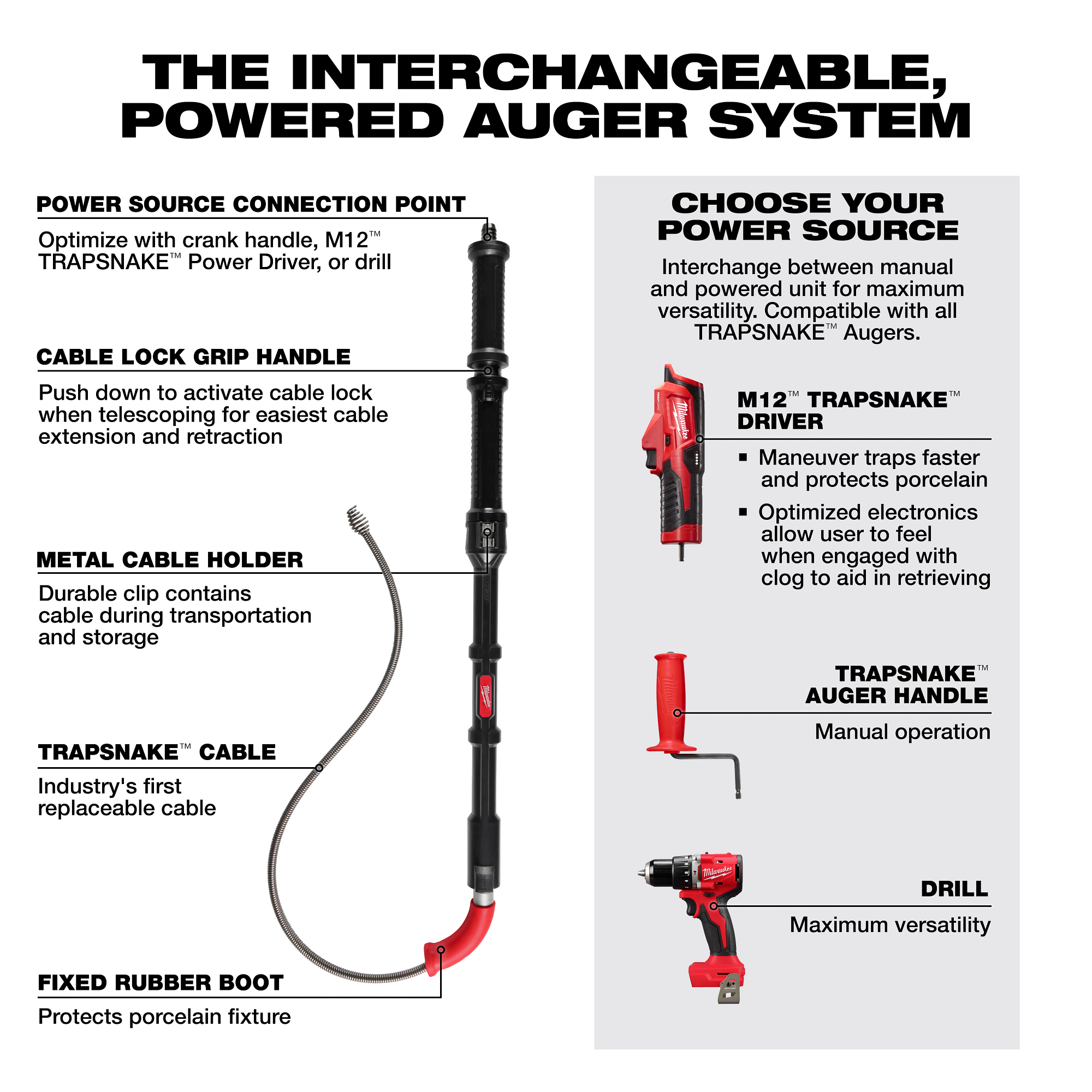 The MILWAUKEE® M12™ TRAPSNAKE™ 6 ft. Toilet Auger Kit is the ideal solution for service plumbers and facility maintenance crews to unclog toilets and floor traps. Powered by the MILWAUKEE® M12™ TRAPSNAKE™ Driver, the first powered unit optimized for the challenges of porcelain fixtures, this unit delivers power and speed to work through tough clogs in tight traps. Optimized electronics protect the fixture from the auger and allow the user to feel when engaged with a blockage to aid in retrieving. Milwaukee® toilet auger features several industry-firsts including a fixed rubber boot for maximum porcelain protection, an integrated locking mechanism that holds the cable in place for easy telescoping extension, and replaceable cables to maximize the longevity of the tool. As part of Milwaukee® TRAPSNAKE™ Porcelain Auger System, users can interchange the M12™ TRAPSNAKE™ Driver with the auger handle or use with other auger attachments for versatility and capabilities never seen before in a closet auger. This kit includes an M12™ TRAPSNAKE™ Driver, one M12™ REDLITHIUM™ CP 1.5 Battery Pack, and an M12™ Battery Charger.