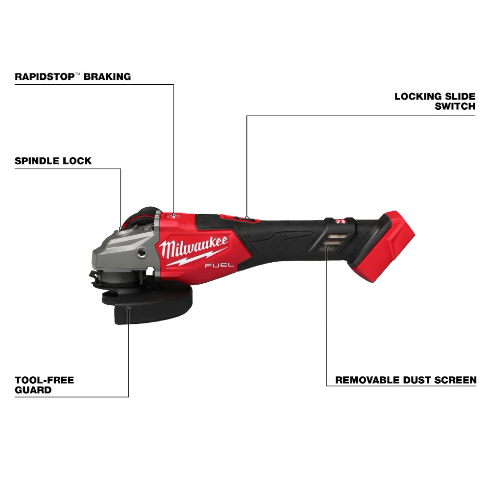 Our M18 FUEL™ 4-1/2″ / 6″ Braking Grinder Slide Switch is the next advancement in power and performance, generating 13A corded power, fastest cutting, and delivering up to 135 cuts per charge. TheM18 FUEL™ 4-1/2″ / 6″ Braking Grinder Slide Switch generates 13A corded power allowing you to complete the toughest grinding and cutting applications, all on the M18™ Cordless System. The POWERSTATE™ Brushless Motor delivers maximum sustained power and 9,000 RPM to remove material faster and increase productivity. REDLINK PLUS™ Intelligence ensures unmatched levels of performance, protection, and compatibility. The RAPIDSTOP™ Brake provides stop times under 2 seconds with an abrasive disc. The M18 FUEL™ 4-1/2″ / 6″ Braking Grinder Slide Switch includes an electronic clutch for kickback protection, as well as overload protection to maximize motor life. Pair with the M18™ REDLITHIUM™ FORGE™ XC8.0 Battery Pack for HIGH OUTPUT™ HD12.0 power in a smaller size, and longest life vs. REDLITHIUM™ batteries. The MILWAUKEE® M18 FUEL™ 4-1/2″ / 6″ Braking Grinder Slide Switch takes cordless grinders to the next level in performance and run-time.