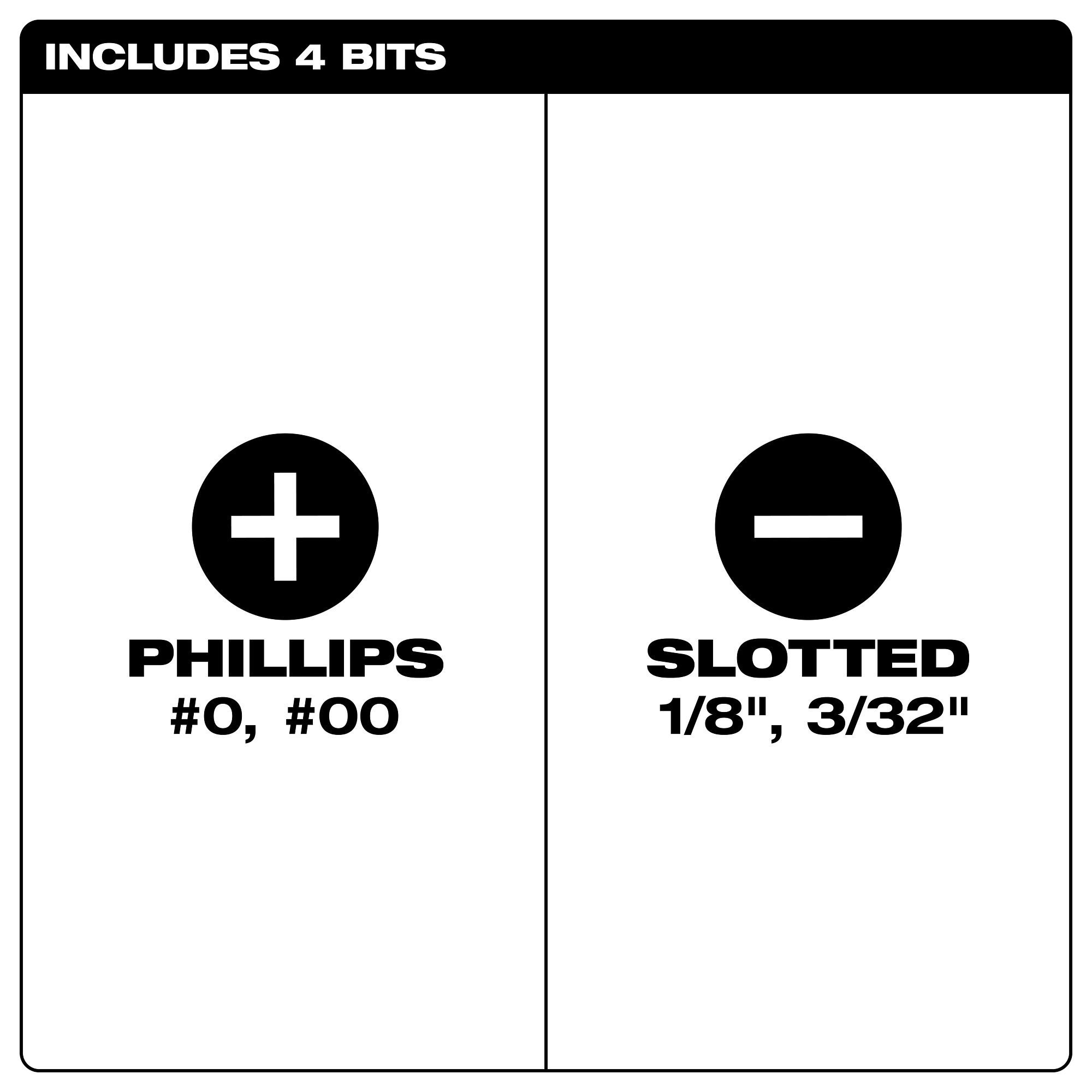 The Milwaukee® 4-in-1 Precision Multi-Bit screwdriver is more versatile and has better control for driving and precise tuning. This multi-bit driver features a 360-degree rotating back cap which offers greater control for speed and precision on the jobsite. It also has a comfortable, non-slip grip for maximum control. The two double-sided bits are stored neatly in the removable shank for quicker bit switches. The chrome-plated bit holder provides rust protection and reduces wear from elements on the jobsite. The Milwaukee® 4-in-1 Multi-Bit Screwdriver is backed by Milwaukee’s Limited Lifetime Warranty.
