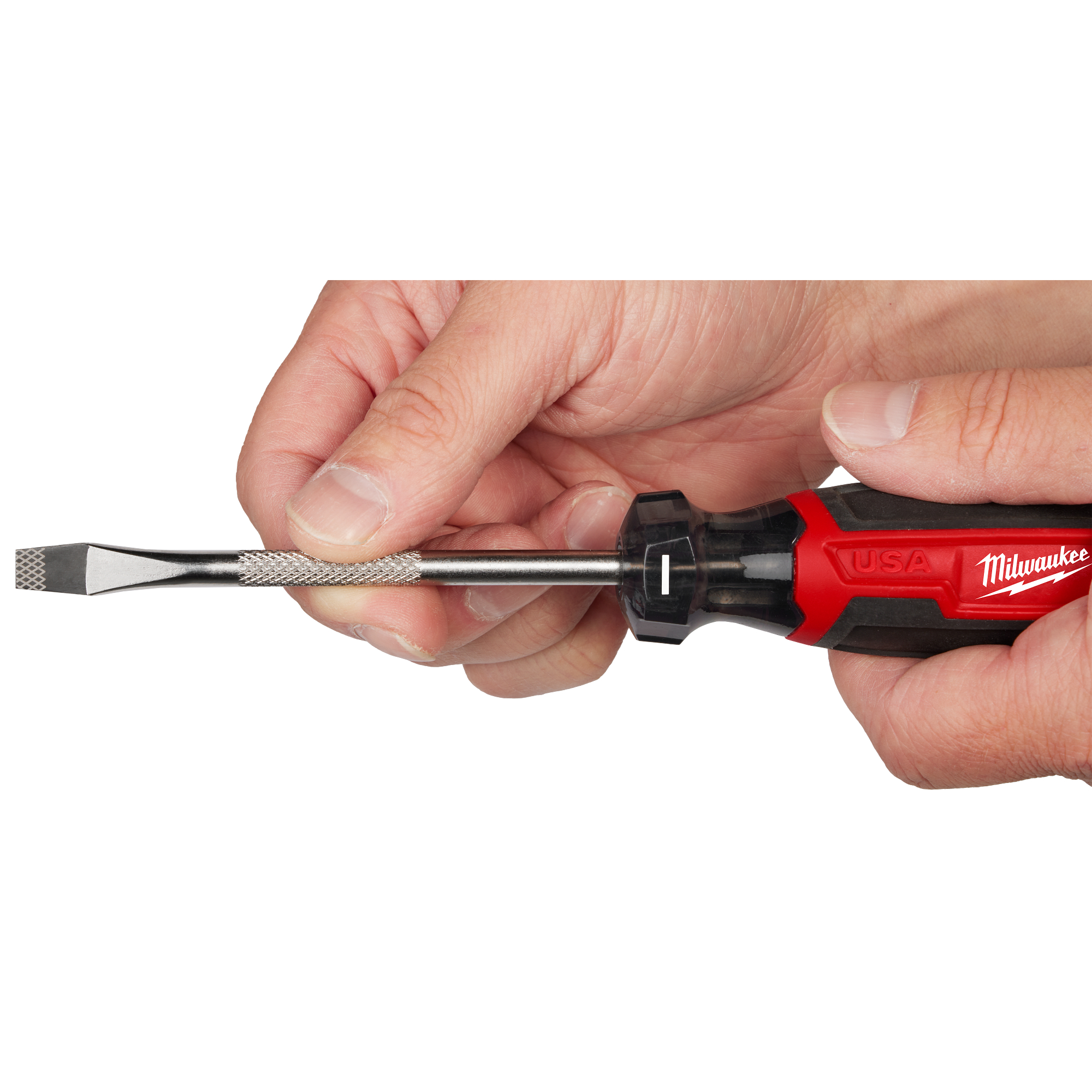 The Milwaukee® #2 Phillips 4″ Cushion Grip Screwdrivers (USA) are manufactured to give the professional the best-fitting screwdriver with max grip. These screwdriver tips are custom machined to deliver a precise fit and reduce stripping during demanding fastening applications. For added confidence, the tips are laser etched to increase the gripping surface. Manufactured with high-strength boron-infused steel for increased hardness, these screwdrivers stand up to the demands of the site with ultimate durability and life. Providing increased versatility, select screwdrivers include a wrench-ready bolster for added torque and a knurled shank for precision control. Quick identification markings on the handle make it easy to identify screwdriver tip size, including Phillips, cabinet, ECX, slotted, and square. The demolition screwdrivers also include a hammer-ready strike cap. The screwdrivers range in shank sizes from 3-inch to 10-inch. Milwaukee Cushion Grip Screwdrivers (USA) are made in the USA with best-in-class manufacturing technology and USA-sourced materials all backed by a complete Lifetime Guarantee.