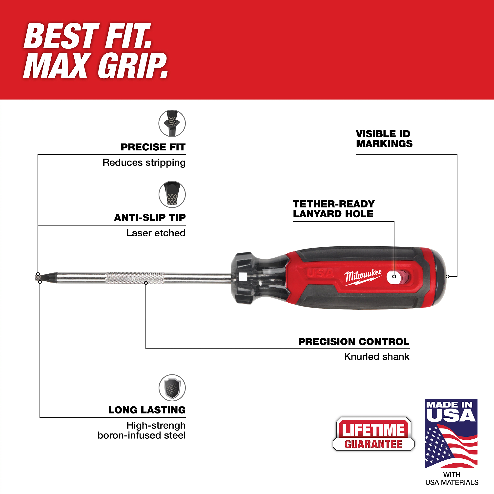 The Milwaukee® #2 Square 4″ Cushion Grip Screwdrivers (USA) are manufactured to give the professional the best-fitting screwdriver with max grip. These screwdriver tips are custom machined to deliver a precise fit and reduce stripping during demanding fastening applications. For added confidence, the tips are laser etched to increase the gripping surface. Manufactured with high-strength boron-infused steel for increased hardness, these screwdrivers stand up to the demands of the site with ultimate durability and life. Providing increased versatility, select screwdrivers include a wrench-ready bolster for added torque and a knurled shank for precision control. Quick identification markings on the handle make it easy to identify screwdriver tip size, including Phillips, cabinet, ECX, slotted, and square. The demolition screwdrivers also include a hammer-ready strike cap. These screwdrivers range in shank sizes from 3-inch to 10-inch. Milwaukee Cushion Grip Screwdrivers (USA) are made in the USA with best-in-class manufacturing technology and USA-sourced materials all backed by a complete Lifetime Guarantee.