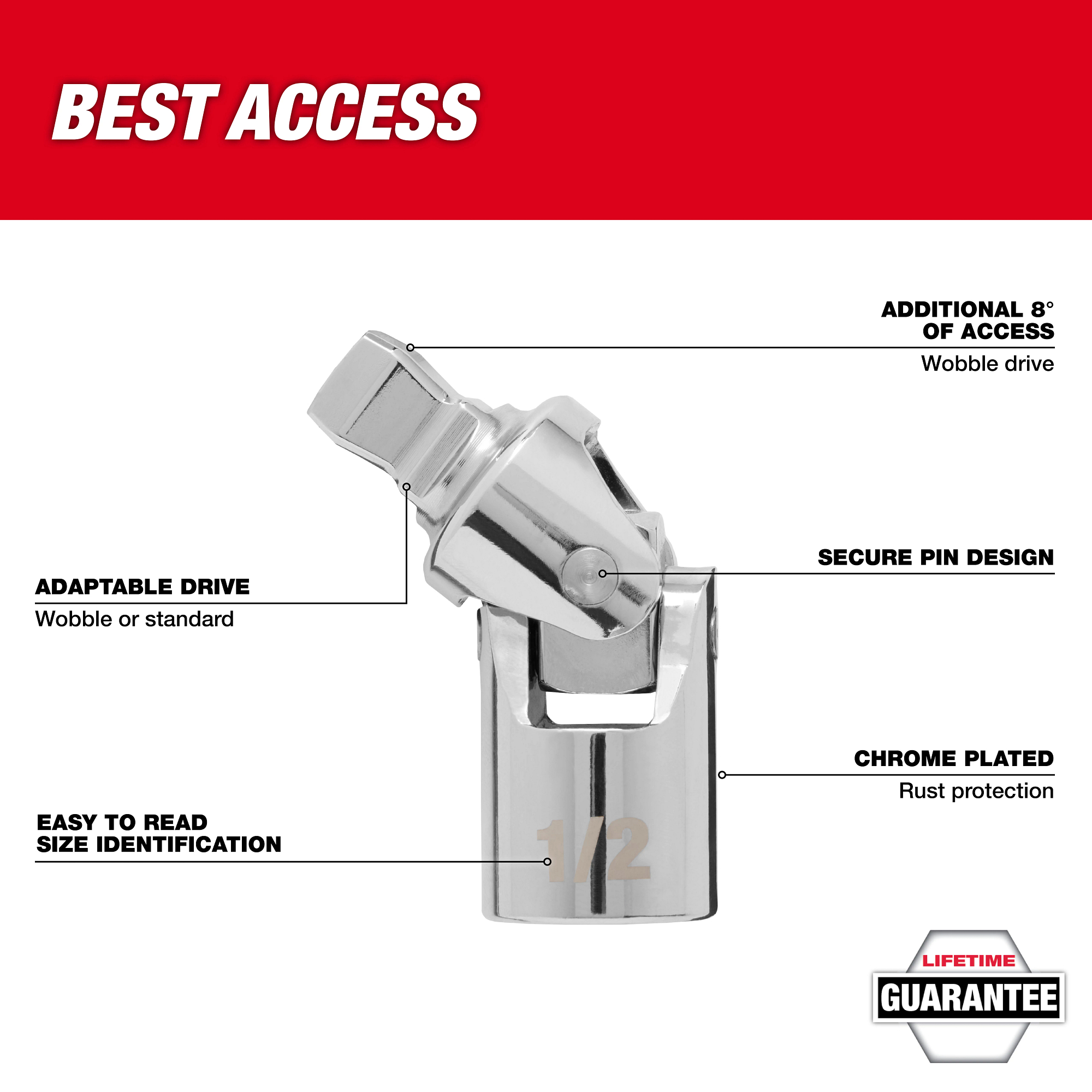 The 1/2″ Drive Universal Joint features a male square end with wobble design, providing up to 8 degrees of additional movement for the best access. The male end is designed to provide the versatility of using in the standard fixed position or the wobble position. The universal joint is held together by a secure pin and has chrome plating for corrosion and rust protection. All Milwaukee® Mechanics Hand Tools are backed by a lifetime guarantee.