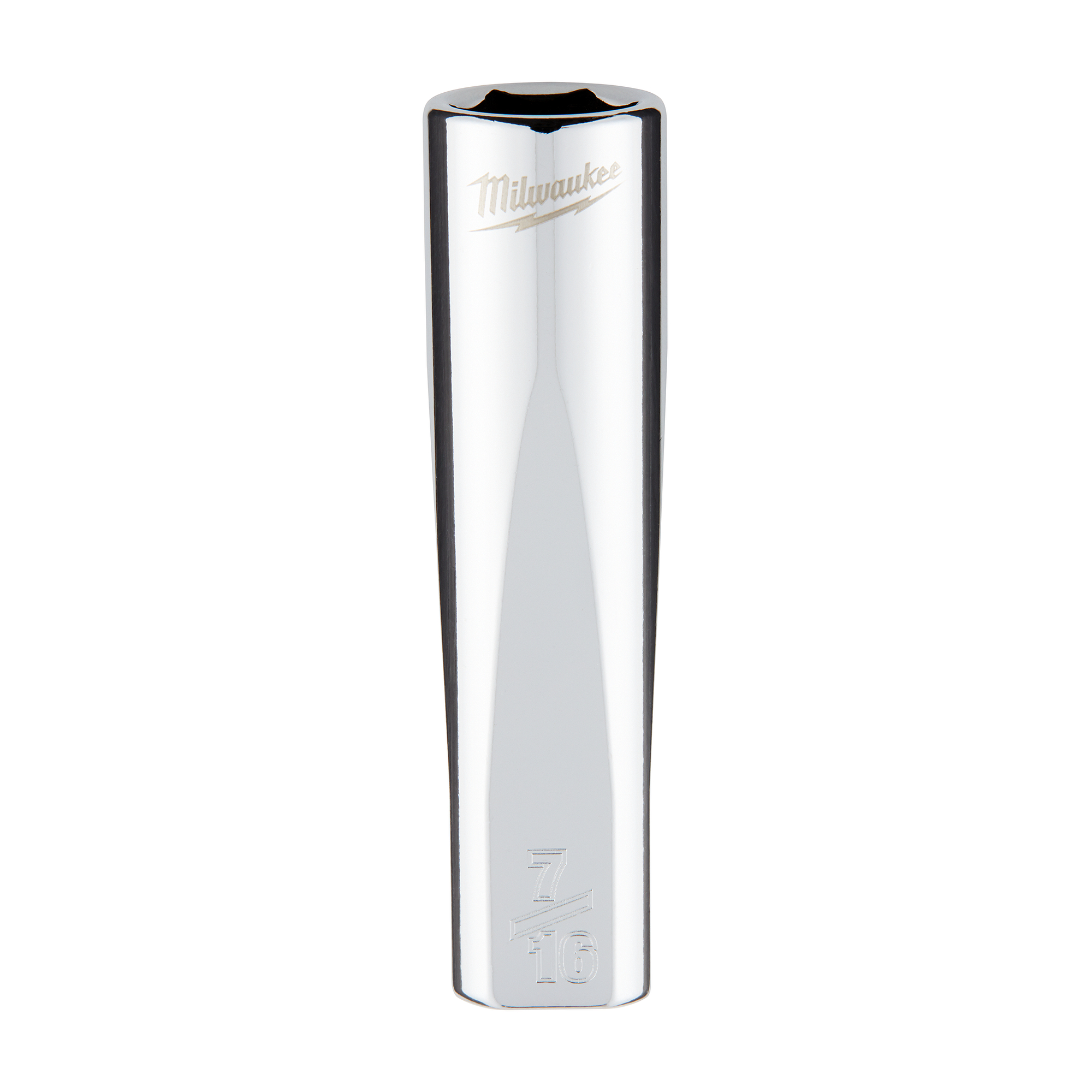 The MILWAUKEE® 3/8″ Drive 7/16″ SAE 6-Point Deep Socket with FOUR FLAT™ Sides was designed from the ground up to be part of the most versatile socket family. The 3/8″ drive sockets are wrench-ready and feature an innovative design with four parallel flat sides to deter rolling. SAE socket sizes are stamped into the flats for better visibility. Optimized deep well socket geometry helps reduce bolt rounding and stripping.