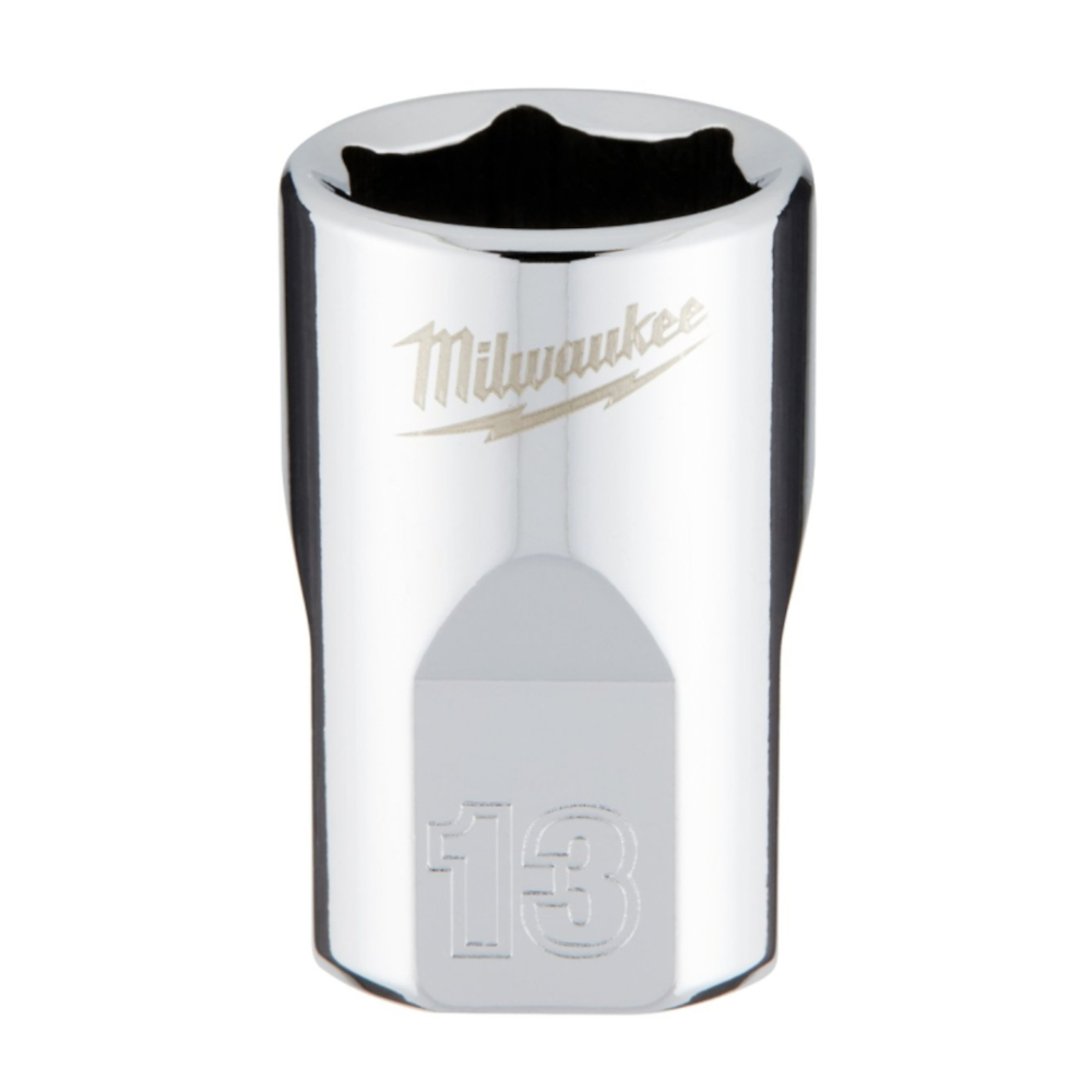 The MILWAUKEE® 3/8″ Drive 13mm Metric 6-Point Socket with FOUR FLAT™ Sides was designed from the ground up to be part of the most versatile socket family. The 3/8″ drive sockets are wrench-ready and feature an innovative design with four parallel flat sides to deter rolling. Metric socket sizes are stamped into the flats for better visibility. Optimized socket geometry helps reduce bolt rounding and stripping.