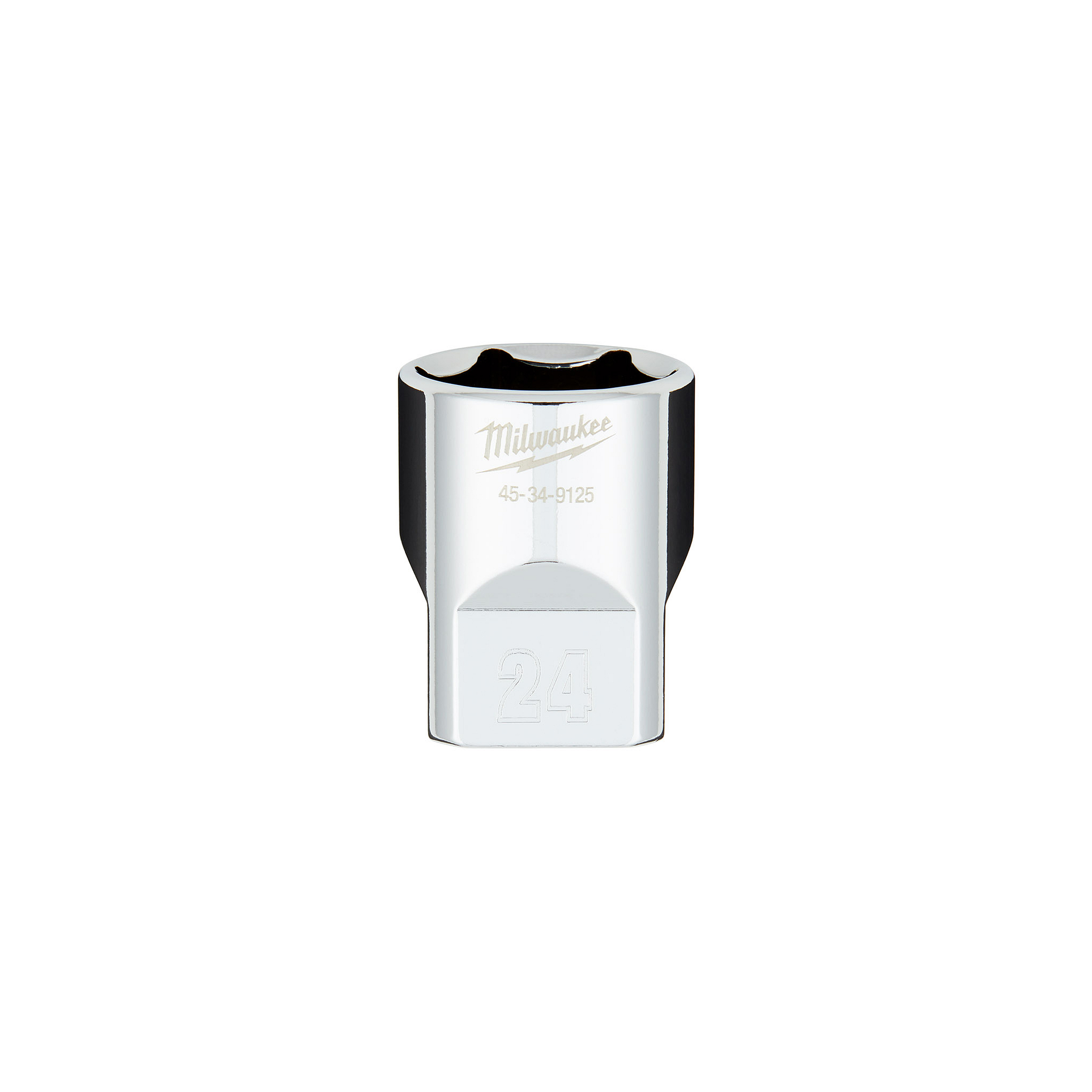 The MILWAUKEE® 1/2″ Drive 24mm Metric 6-Point Socket with FOUR FLATâ„¢ Sides was designed from the ground up to be part of the most versatile socket family. The 1/2″ drive sockets are wrench-ready and feature an innovative design with four parallel flat sides to deter rolling. Metric socket sizes are stamped into the flats for better visibility. Optimized socket geometry helps reduce bolt rounding and stripping.