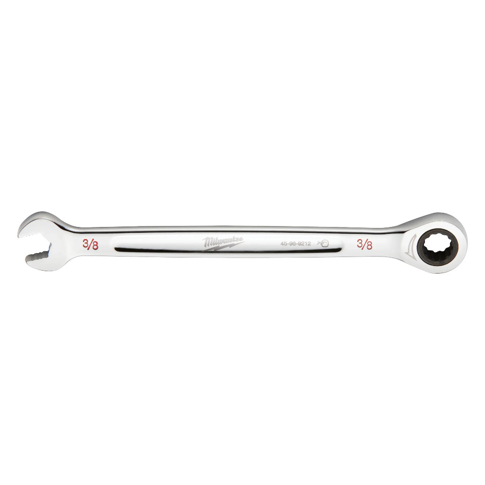 The MILWAUKEE® 3/8 in. SAE Ratcheting Combination Wrench offers 2.5 degrees of arc swing and 144 ratcheting positions for quick and efficient work in tight spaces. This wrench has double-stacked pawls within the ratcheting mechanism to increase durability and extend the life of the tool. The innovative Milwaukee MAXBITEâ„¢ Open-End Grip improves the ratchet wrench’s grip on nuts and bolts, delivering 25% more torque than smooth-faced wrenches. The combination wrench has an ergonomic I-Beam handle design for improved comfort and ink-filled size labels for easy size identification and distinction between SAE and metric sets. This open end ratchet wrench features a Lifetime Guarantee.