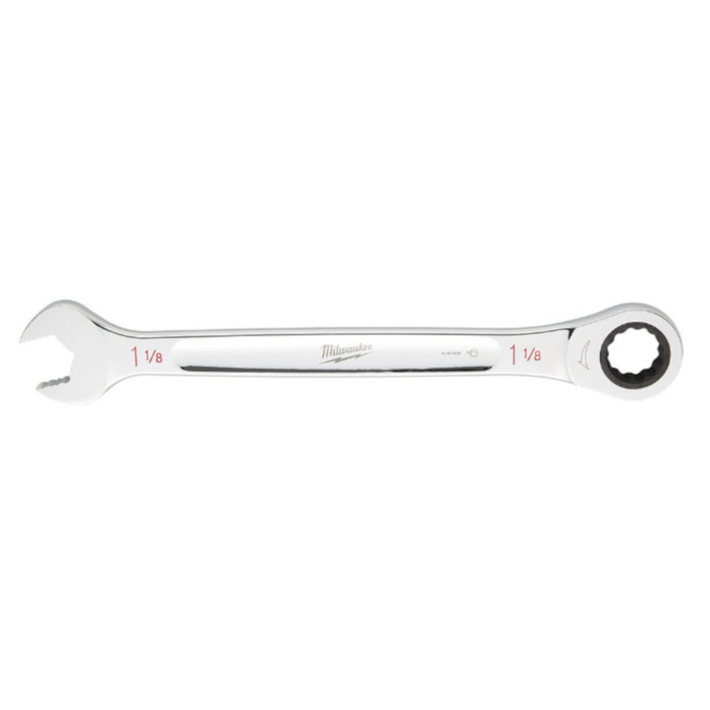 The MILWAUKEE® SAE Ratcheting Combination Wrenches feature 2.5 degrees of arc swing and 144 ratcheting positions, allowing quick and efficient work in tight spaces. The Milwaukee ratcheting wrench has double-stacked pawls within the ratcheting mechanism, which increases durability and extends the life of the tool. MILWAUKEE® MAXBITE™ Open-End Grip improves the wrench’s grip on nuts and bolts, offering 25% more torque than smooth-faced wrenches. The combination wrench features an ergonomic I-Beam handle design for improved comfort and ink-filled size labels for easy size identification and quick distinction between SAE and metric sets. The MILWAUKEE® SAE wrench sizes range from 1/4″ to 1-1/4″ and feature Milwaukee’s Lifetime Guarantee.